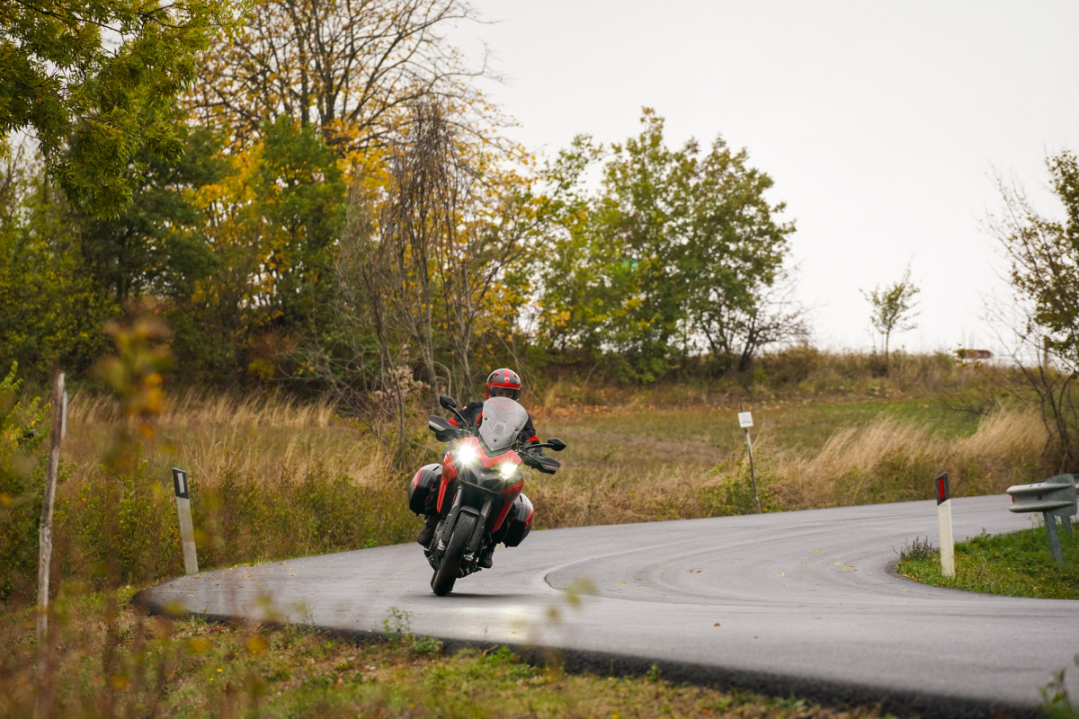 Wspólny posiłek z pasjonatami motocykli z różnych europejskich krajów był idealnym zwieńczeniem pierwszego dnia. Podczas kolacji rozmawialiśmy o przemierzaniu świata na dwóch kołach i niesamowitych przygodach z jednośladami w tle. Multistrada V2 to motocykl doskonały do takich podróży. Jest komfortowy, intuicyjny i łatwy w prowadzeniu. Zapewnia też odpowiedni poziom bezpieczeństwa, co udowodnił na mokrej nawierzchni, a zwłaszcza na odcinakach pokrytych śliską warstwą liści. Zgodnie z zaleceniem przewodnika grupy, tego dnia podróżowaliśmy głównie w trybie jazdy Urban, który przeznaczony jest do jazdy w deszczowych warunkach. Kontrola trakcji i ABS interweniują wcześniej niż w pozostałych trybach, a aktywne zawieszenie ma bardziej miękką charakterystykę pracy. W ulewie opony Pirelli Scorpion Trail II zapewniały dużą pewność prowadzenia, a komfort jazdy poprawiały podgrzewane manetki. Wszyscy liczyliśmy jednak na to, że kolejnego dnia pogoda dopisze nam na tyle, abyśmy mogli w końcu wykorzystać pełny potencjał drzemiący w motocyklu turystycznym z Borgo Panigale.