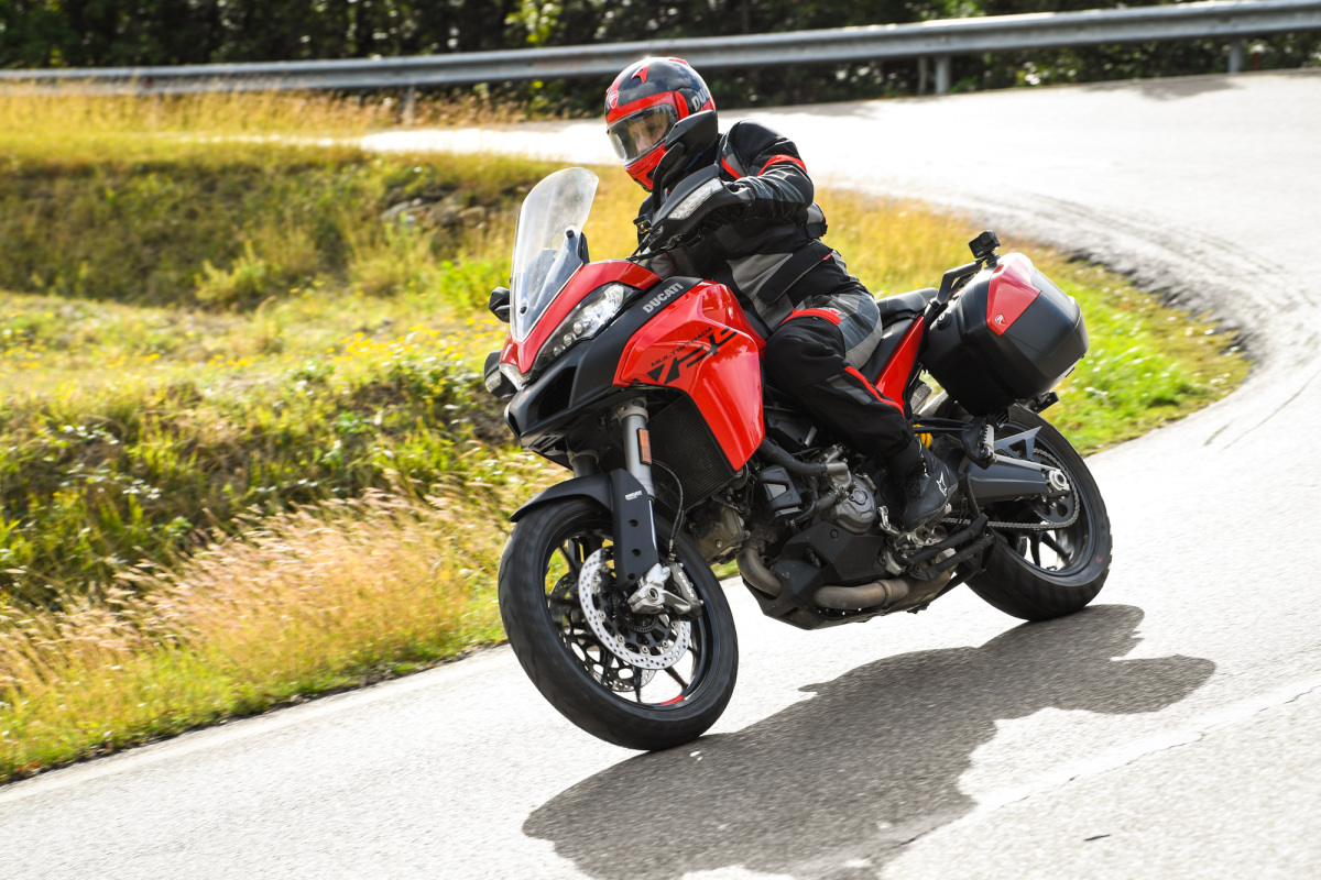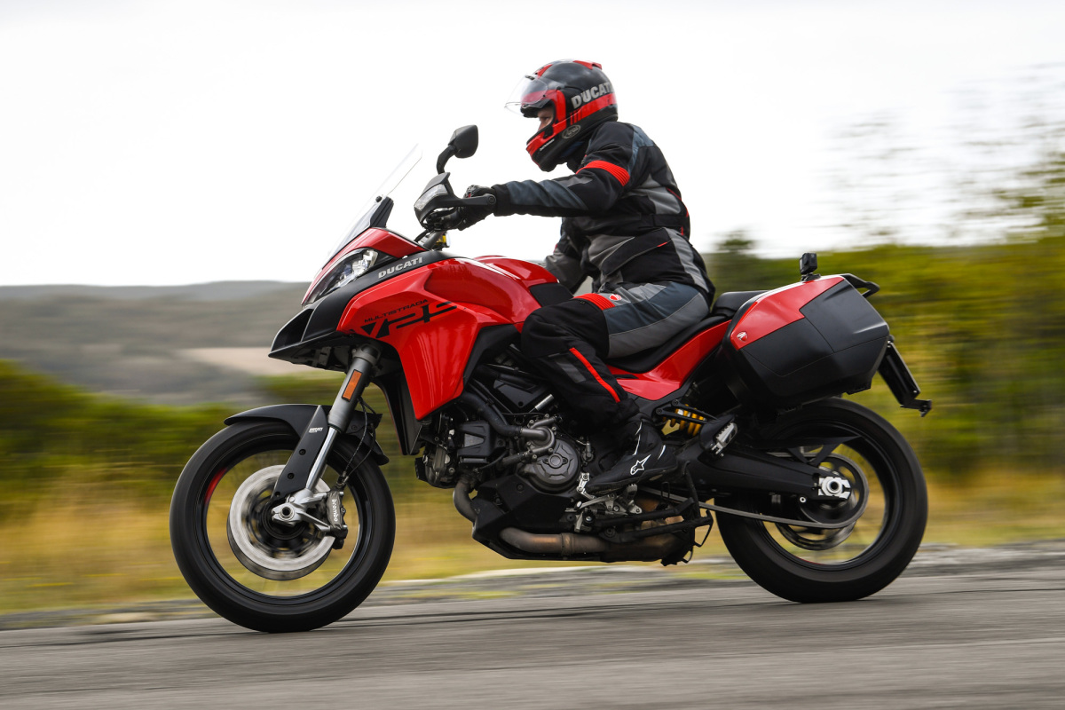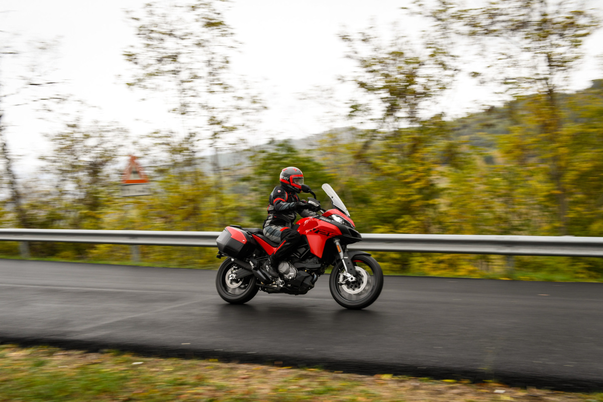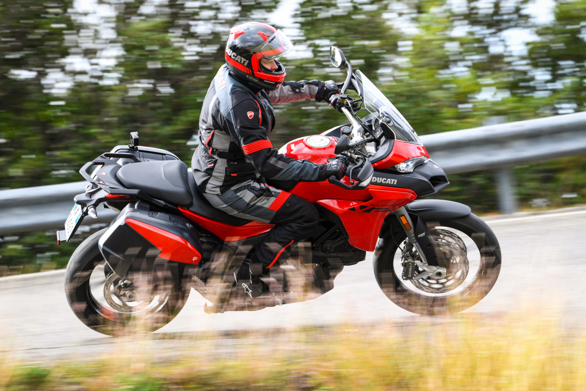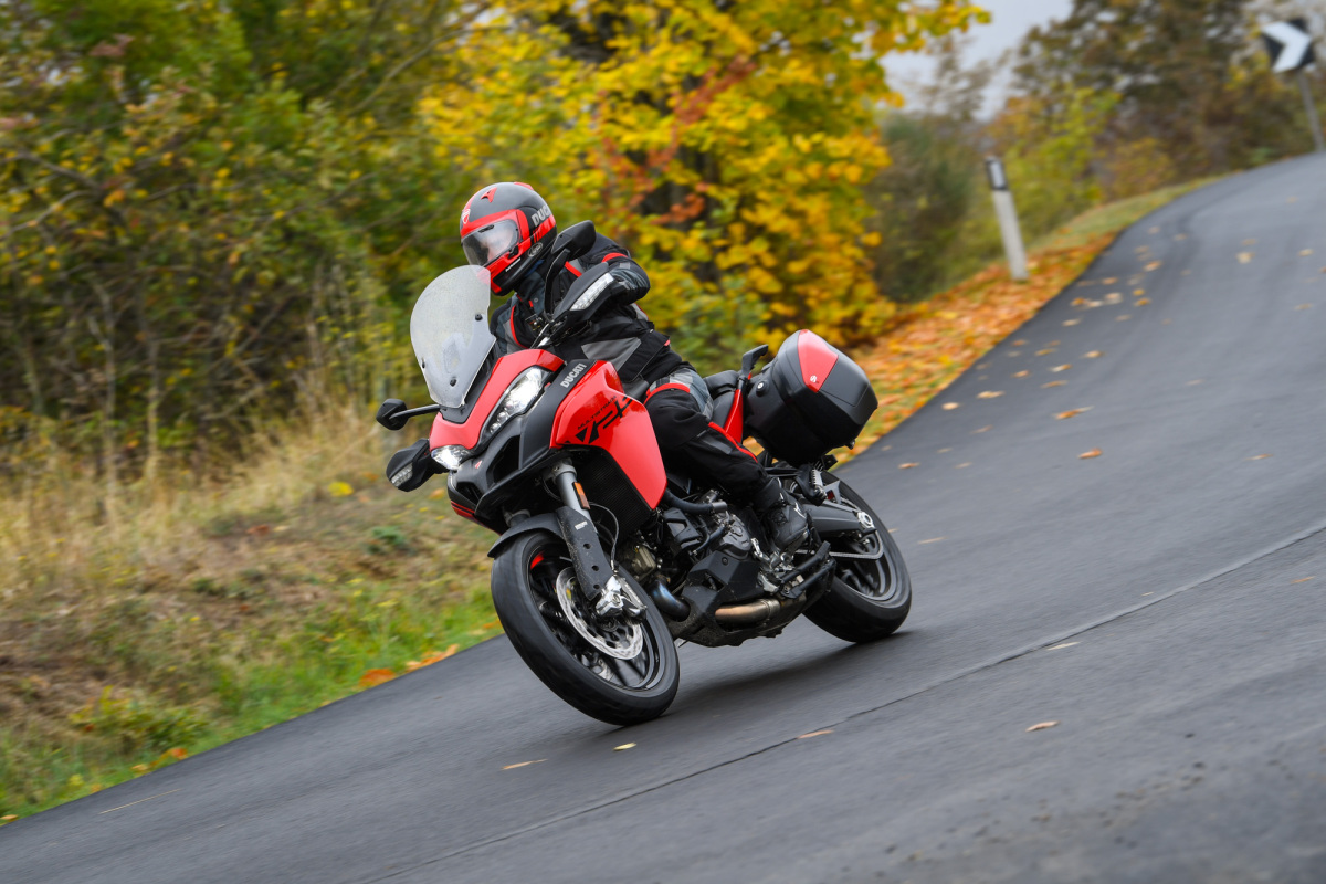 Multistrada V2 jest o 5 kilogramów lżejsza od poprzednika. To zasługa między innymi lżejszych kół przejętych z Multistrady V4, lżejszego sprzęgła, czy nowych korbowodów. Silnik V2 wciąż ma 937 centymetrów sześciennych pojemności i 113 koni mocy. Względem odchodzącego modelu jednostka straciła 2 Nm momentu obrotowego, ale maksymalną wartość 94 Nm osiąga wcześniej, przy 6750 obr./min. Testastretta lubi wysokie obroty, zwłaszcza powyżej 7000 obr/min, kiedy przyjemnie brzmi i prowokuje do szybkiej jazdy. Charakterystyka pracy silnika zmienia się w zależności od wybranego trybu: Enduro, Urban, Touring i Sport. Efektywnemu napędzaniu się i wytracaniu prędkości pomaga świetnie działający quickshifter w górę i w dół. Na pochwałę zasługują też hamulce Brembo z systemem ABS działającym w złożeniu, a także półaktywne zawieszenie Ducati Skyhook Suspension. W trybie Urban miękko wybiera nierówności, w Touring zwiększa stabilność, a w Sport jest sztywne i precyzyjne.