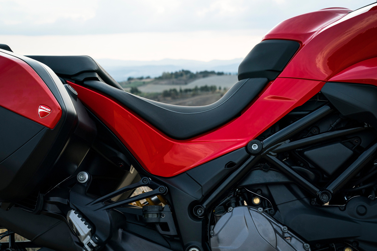 Najważniejsza zmiana względem Multistrady 950 to poprawiona ergonomia jazdy. Standardowo siedzisko ma wysokość 830 mm i jest 10 mm niżej niż w poprzednim modelu. Akcesoryjną kanapą, a także opcjonalnym zawieszeniem można zmniejszyć tę wysokość do 790 mm. Siedzisko w miejscu styku ze zbiornikiem jest mocno wyprofilowane, aby pewnie opierać nogi na nawierzchni, a podnóżki niżej zamocowane. Przeprowadzone zmiany odczują zatem przede wszystkim osoby niskie, a także początkujący motocykliści.