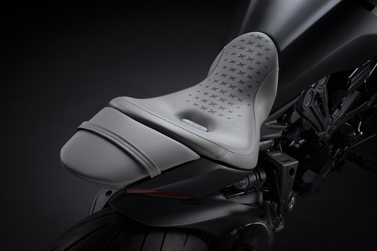 Najbardziej charakterystycznym elementem XDiavela Nera jest specjalne siedzenie wykonane z Pelle Frau®: miękkiej naturalnej skóry, która dostępna jest w pięciu różnych kolorach (Siam Red, Steel Blue, Cemento, India i Selva). Pięciuset Ducatisti, którzy zamówią limitowanego XDiavela otrzymają również ekskluzywne etui na kluczyk i na dokumenty wykonane ze skóry Pelle Frau® w kolorze pasującym do kanapy.
