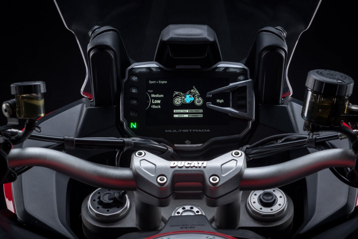 Multistrada V2 w wersji S gwarantuje 5-gwiazdkową podróż dzięki wzorcowemu w tym segmencie pakietowi wyposażenia, który obejmuje m. in. elektroniczne zawieszenie Skyhook, tempomat, reflektory full-LED wyposażone w funkcję Ducati Cornering Lights, która optymalizuje oświetlenie drogi w zależności od pochylenia motocykla, Ducati Quick Shift Up & Down, system Hands Free, 5-calowy kolorowy wyświetlacz TFT o wysokiej rozdzielczości z intuicyjnym interfejsem i podświetlanymi elementami sterującymi na kierownicy.
