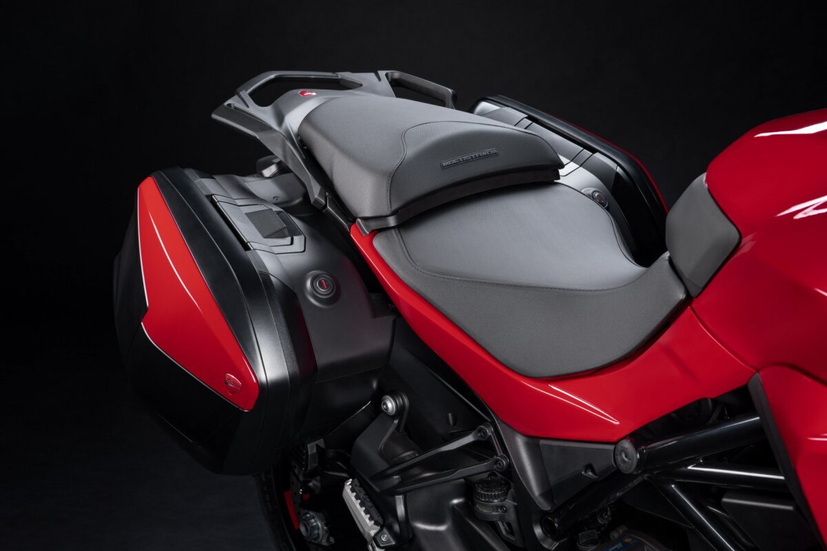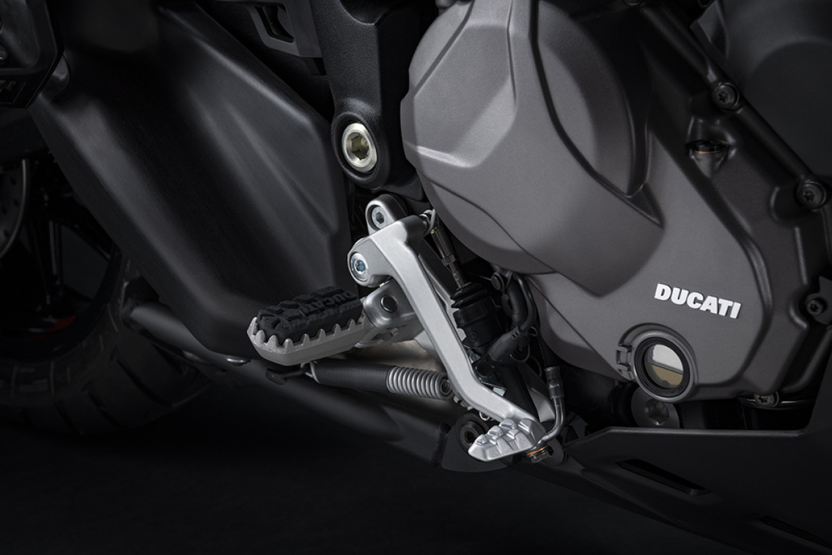 Prace nad kanapą skupiły się również na poprawieniu komfortu jazdy. Nowy kształt siedzenia zapewnia wygodną powierzchnię, która gwarantuje kierującemu swobodę ruchów w kierunku wzdłużnym. W odnalezieniu optymalnej pozycji pomagają też nowe podnóżki przejęte z modelu Multistrada V4, które zapobiegają nadmiernemu zginaniu nóg, a tym samym umożliwiają bardziej relaksującą pozycję podczas długich podróży.