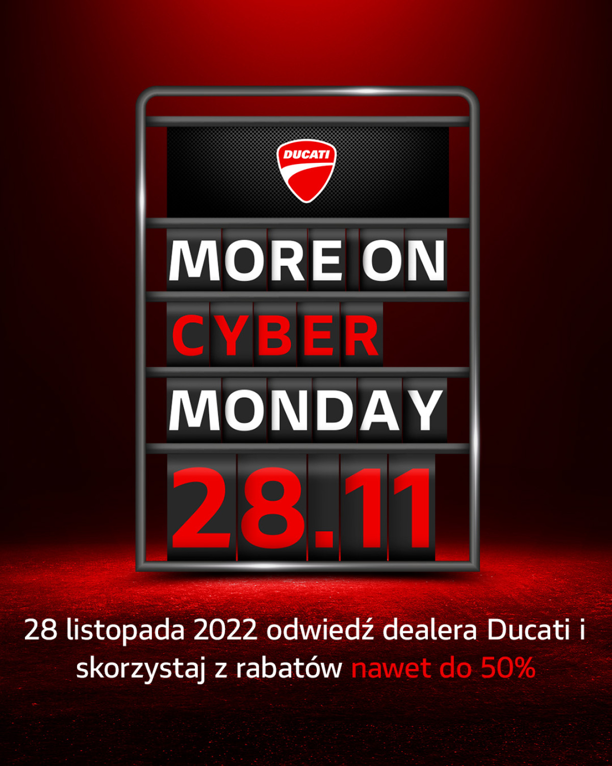 W Cyber Monday ponownie wychodzimy naprzeciw oczekiwaniom Łowców Okazji. To kolejna okazja, aby kupić wybraną odzież motocyklową i lifestylową Ducati w niespotykanie niskich cenach. W dniu 28 listopada odwiedź dealera Ducati i skorzystaj z atrakcyjnych rabatów. Promocja obejmuje wybrany asortyment odzieży, który może różnić się w zależności od stacji dealerskiej. Zapraszamy do dealerów!