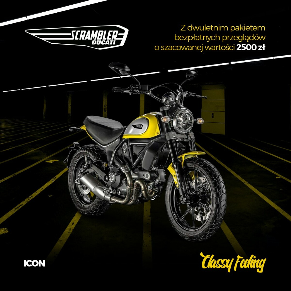 Scrambler Icon to klasyka gatunku i wyraźne nawiązanie do pierwszego Scramblera Ducati. Charakteryzuje się wygodną pozycją, niskim siedziskiem i niedużą masą, co zapewnia łatwość prowadzenia w każdych warunkach. Dwucylindrowy silnik chłodzony powietrzem zapewnia miły dźwięk i przyjemne osiągi.