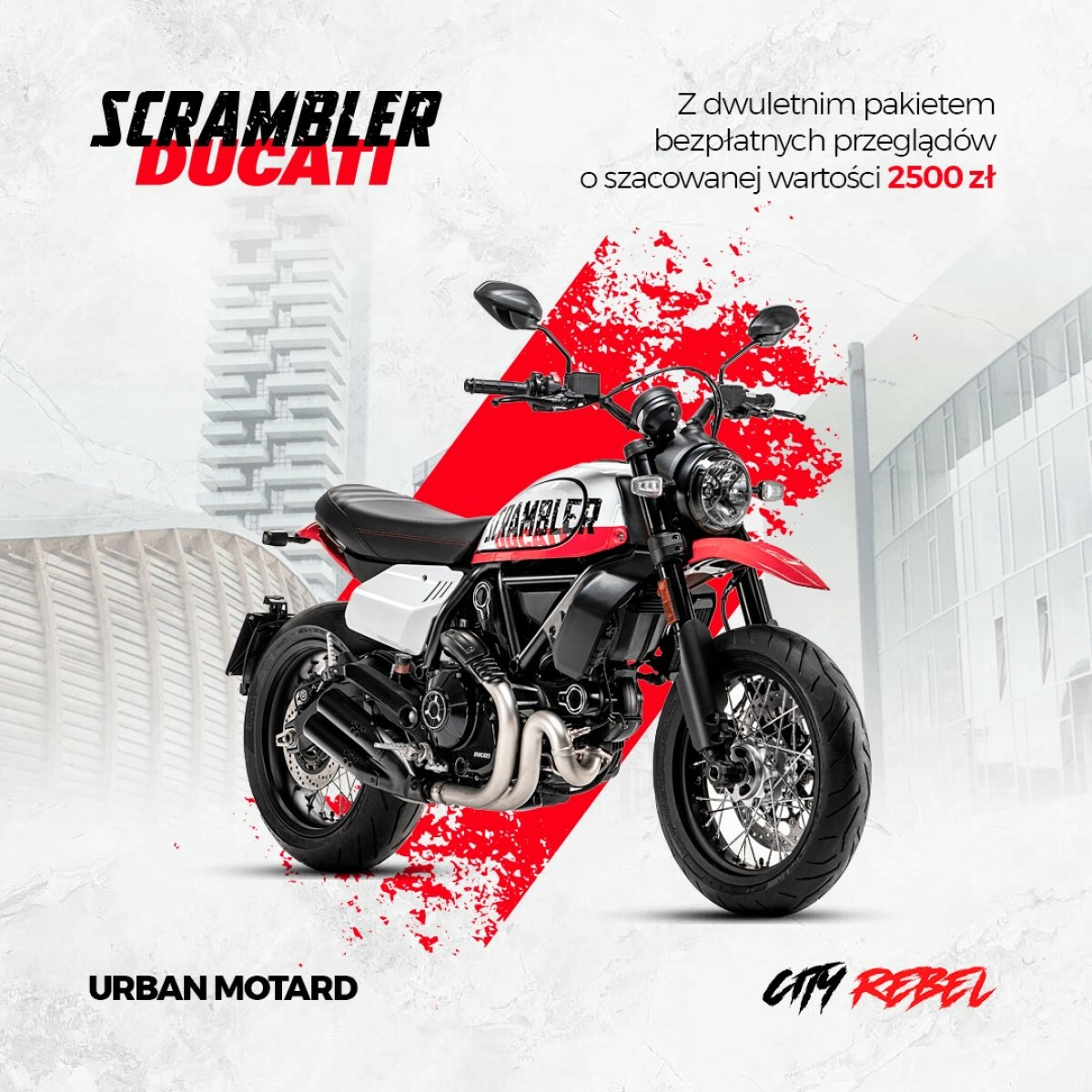 Kultowy Scrambler może być Twój niemal natychmiast, a w dodatku z pakietem atrakcyjnych korzyści. Motocykle z rocznika 2022, standardowo objęte czteroletnią gwarancją bez limitu kilometrów, tylko teraz dostępne są z dwuletnim pakietem bezpłatnych przeglądów. Oznacza to, że przez dwa lata od daty zakupu nie musisz martwić się o koszty standardowych przeglądów swojego motocykla w autoryzowanym serwisie Ducati. W ten sposób możesz zaoszczędzić nawet 2500 złotych!