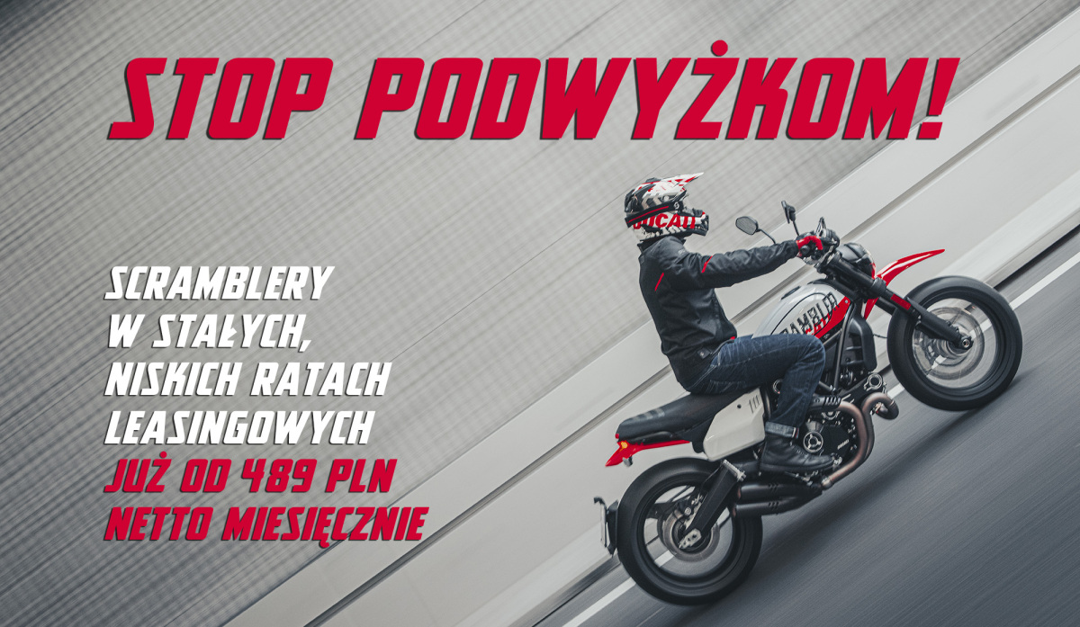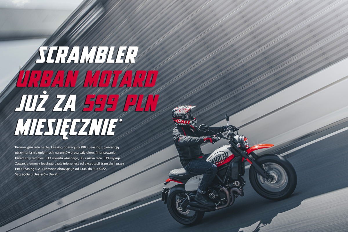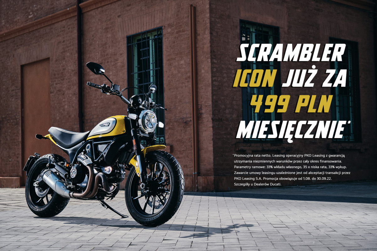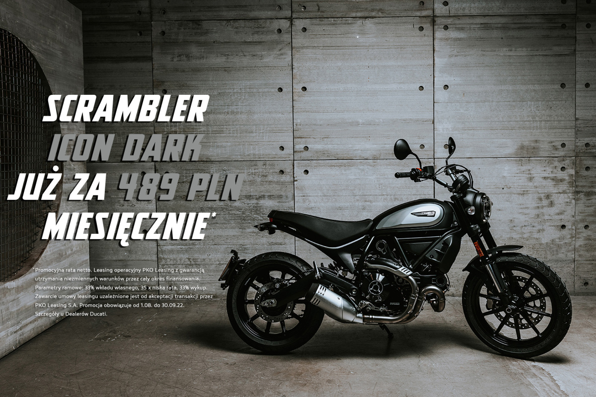 W ramach promocji Scramblera Icona Dark można mieć już od 489 zł netto miesięcznie, Icona w racie od 499 zł netto, a Urban Motarda od 599 zł netto. Raty wyliczone na WIBOR stały 8,5715% WIBOR zmienny 6,32%. W przypadku umowy zawartej na stopie stałej istnieje możliwość zmiany podczas trwania umowy na stopę zmienną. Niniejsza informacja nie stanowi oferty w rozumieniu art. 66 i następnych kodeksu cywilnego. Zawarcie umowy leasingu uzależnione jest od akceptacji transakcji przez PKO Leasing S.A.