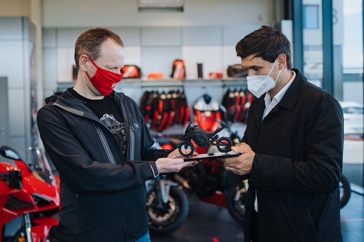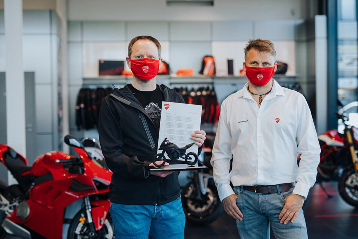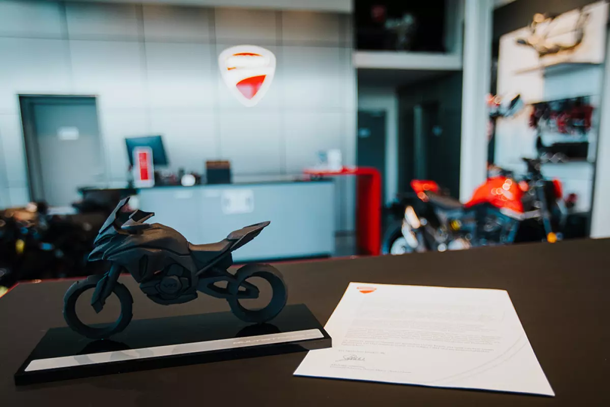 Pan Lebensieg został zaproszony przez Ducati Motor Deutschland do dealera w Ingolstadt, gdzie otrzymał rzeźbiarską reprodukcję Multistrady V4 wraz z osobistym listem potwierdzającym numer seryjny motocykla.