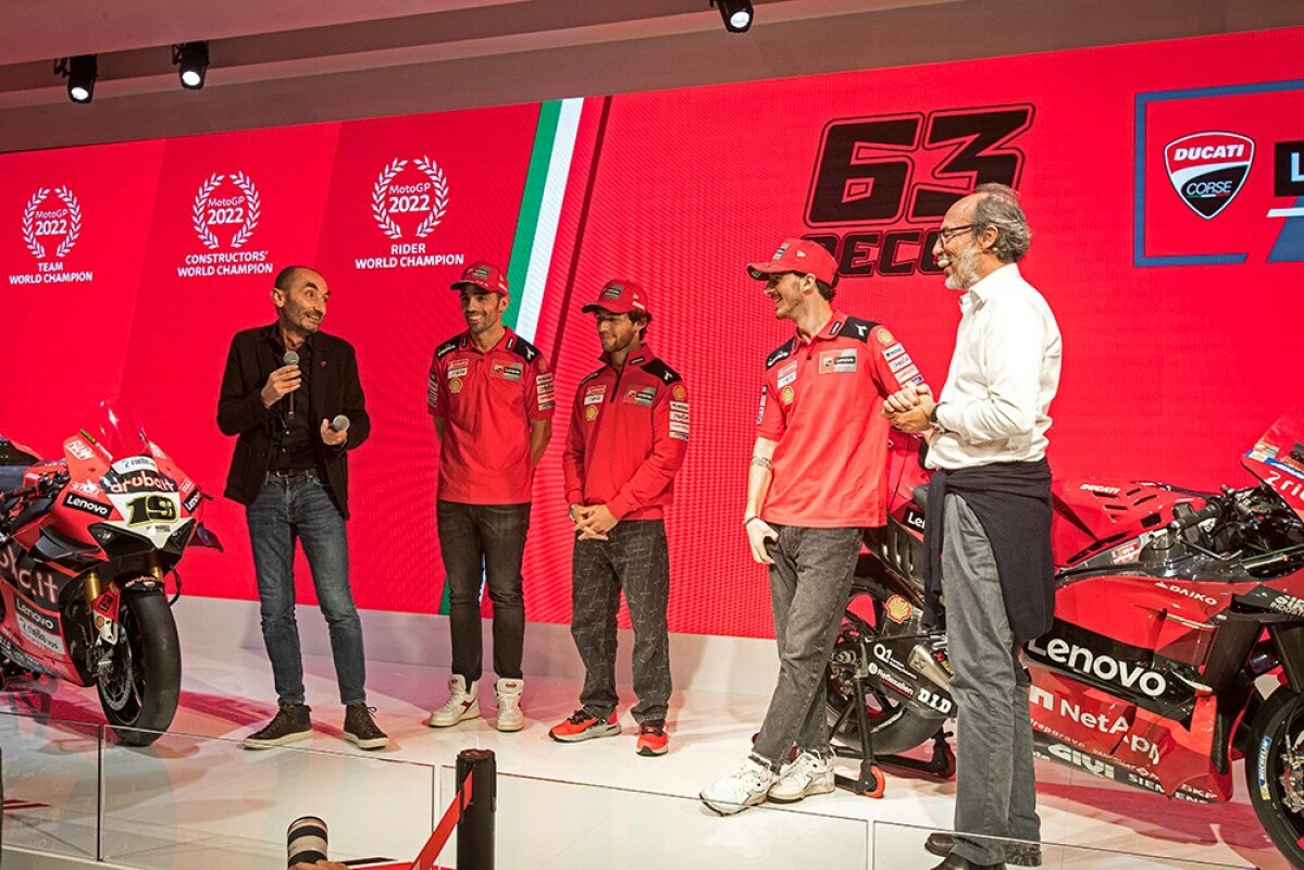 Dyrektor generalny Ducati, Claudio Domenicali, również wyszedł na scenę, aby uczcić „złoty sezon”, w którym Ducati udało się wywalczyć tytuł Mistrza Świata Konstruktorów i Drużynowego Mistrza Świata, a Pecco zakończył go jako Mistrz Świata Kierowców. Triumf "Made in Italy" jest częścią niezwykle pozytywnego momentu dla firmy i odzwierciedla jej wartości: „Styl, Wyrafinowanie i Wydajność”.