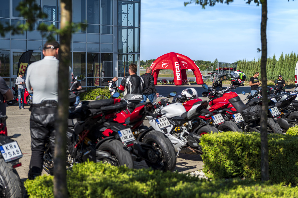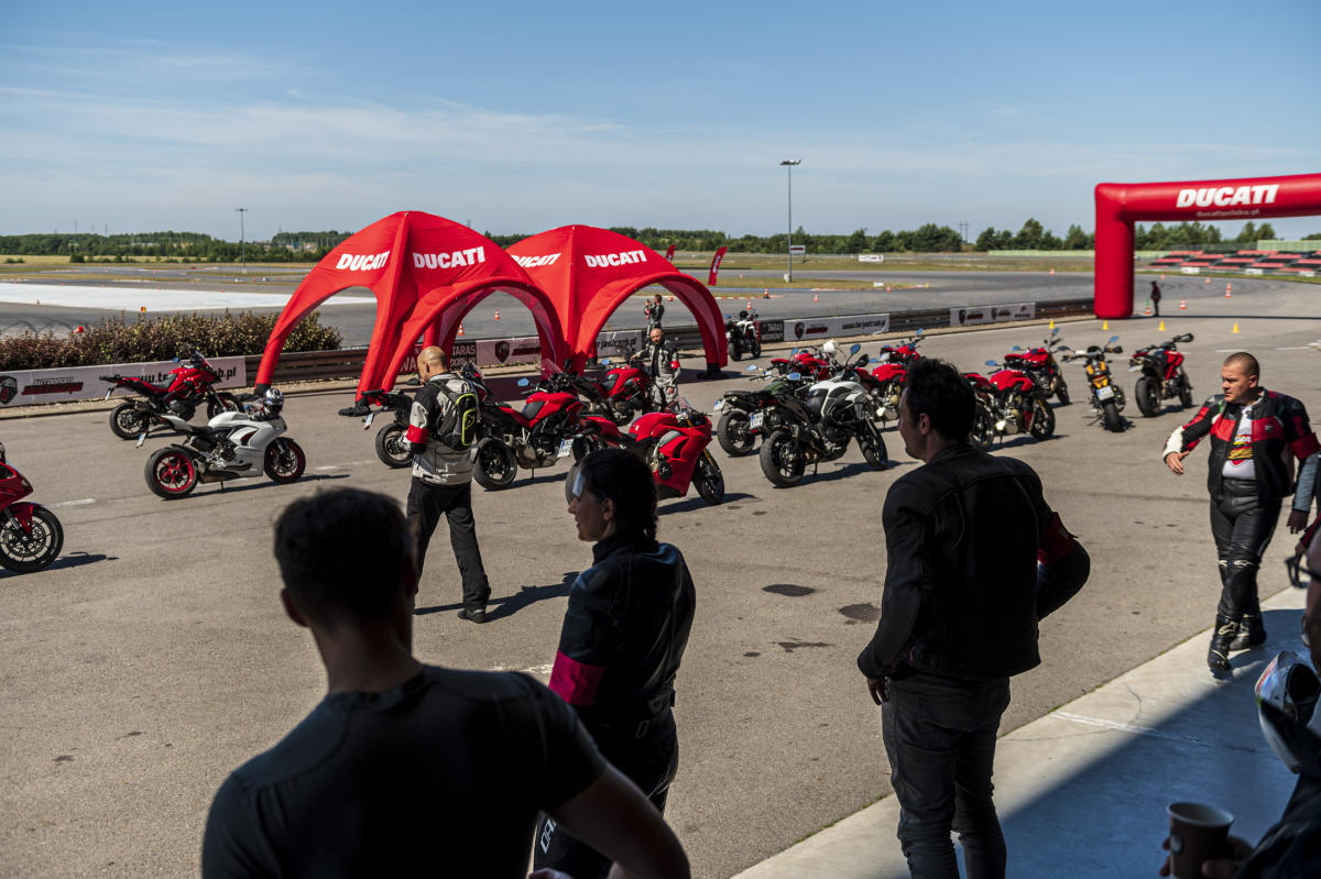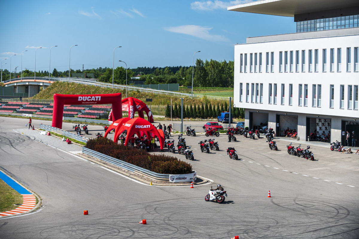 Część uczestników pojawiła się w hotelu już w piątek wieczorem, aby w sobotni poranek obudzić się na torze wyścigowym, na którym wkrótce rozpocząć się miało szkolenie. Zjedliśmy śniadanie na tarasie z widokiem na cały obiekt i czuć było już nadchodzące emocje. Chwilę przed godziną 9:00 w rzędzie ustawiło się niemal 70 różnych modeli Ducati. Dzień rozpoczęliśmy od odprawy. Janusz Czaja opowiedział o planie treningowym na nadchodzące godziny, a także omówił pełną trasę przejazdu i apeksy każdego z zakrętów na torze. Chwilę później podzieleni na grupy spotkaliśmy się w garażach, aby przygotować się do jazdy i nawodnić się przed wyjazdem na nasłoneczniony tor. Asfalt był tego dnia gorący i bardzo przyczepny.