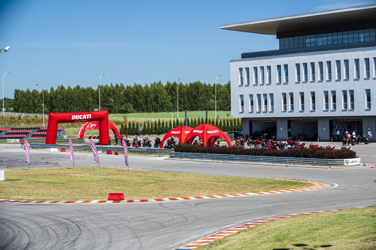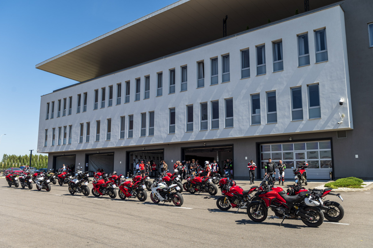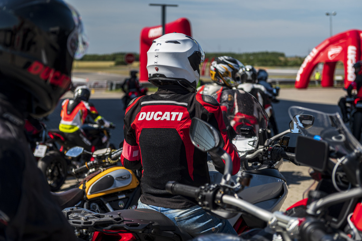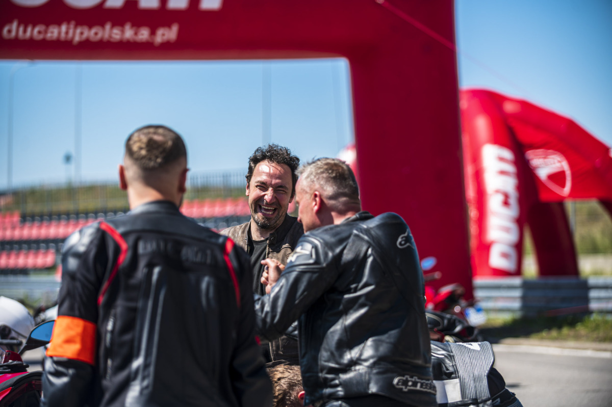 Część uczestników pojawiła się w hotelu już w piątek wieczorem, aby w sobotni poranek obudzić się na torze wyścigowym, na którym wkrótce rozpocząć się miało szkolenie. Zjedliśmy śniadanie na tarasie z widokiem na cały obiekt i czuć było już nadchodzące emocje. Chwilę przed godziną 9:00 w rzędzie ustawiło się niemal 70 różnych modeli Ducati. Dzień rozpoczęliśmy od odprawy. Janusz Czaja opowiedział o planie treningowym na nadchodzące godziny, a także omówił pełną trasę przejazdu i apeksy każdego z zakrętów na torze. Chwilę później podzieleni na grupy spotkaliśmy się w garażach, aby przygotować się do jazdy i nawodnić się przed wyjazdem na nasłoneczniony tor. Asfalt był tego dnia gorący i bardzo przyczepny.