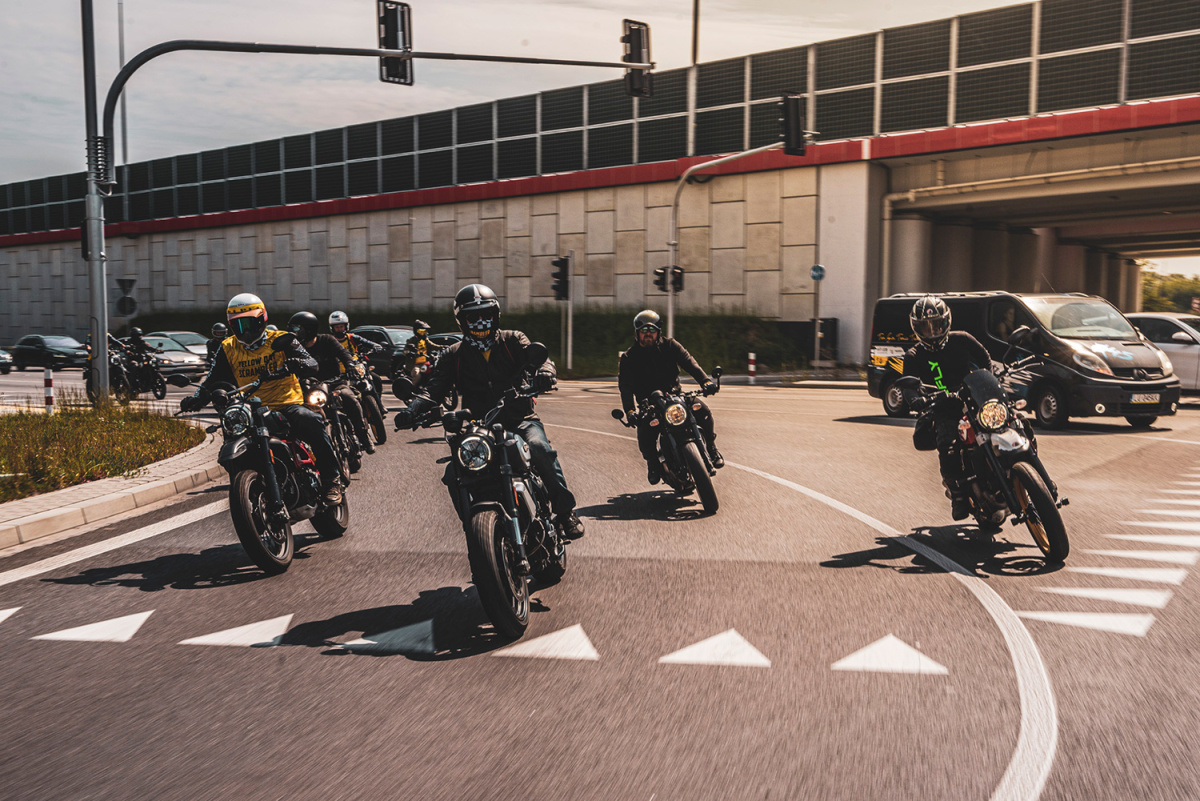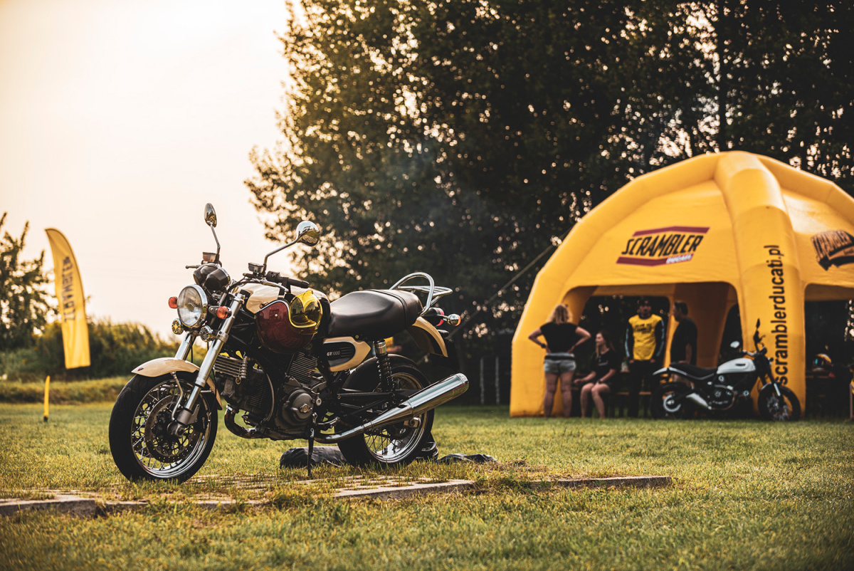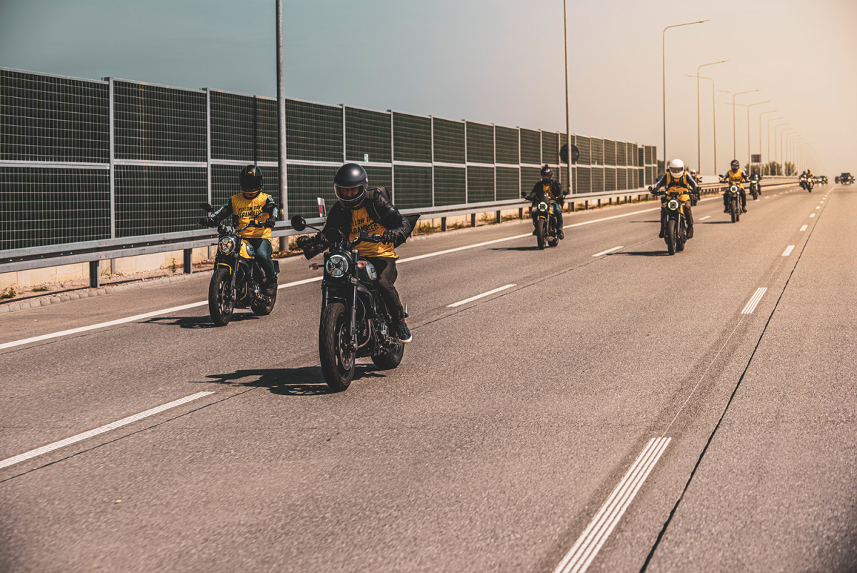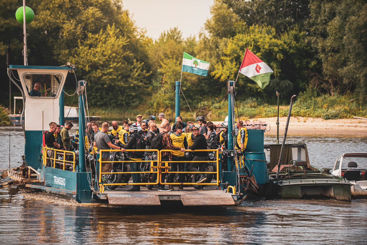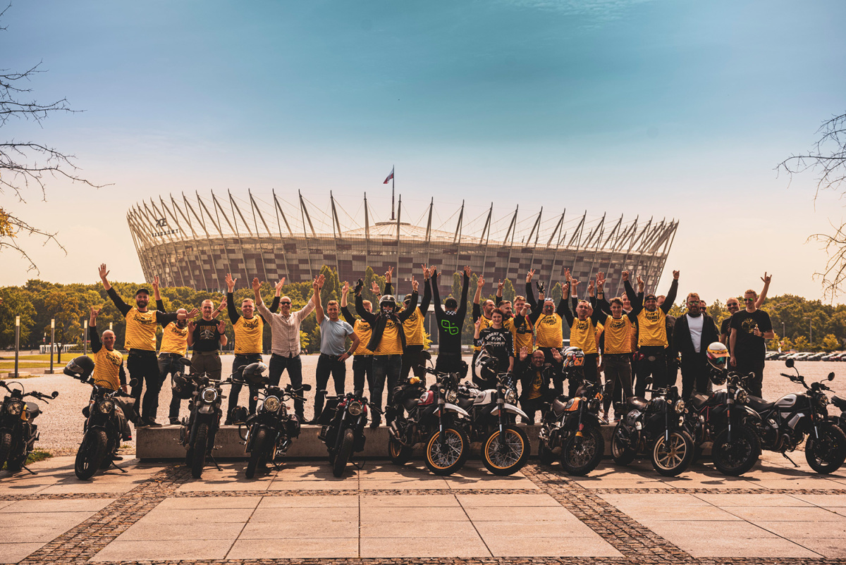 W sobotę 14 sierpnia spotkaliśmy się przed salonem Ducati Liberty Motors w Piasecznie w wyjątkowym składzie. Pijąc kawę obserwowaliśmy jak parking powoli wypełnia się kolejnymi Scramblerami, customami i unikatowymi sprzętami jak Ducati Paul Smart 1000, czy Ducati GT1000 SportClassic. Czuć było już nadchodzącą przygodę, więc wkrótce potem wsiedliśmy na nasze maszyny i ruszyliśmy w żółtym szyku w kierunku promu w Gassach, gdzie wraz z motocyklami przepłynęliśmy na drugą stronę Wisły. Trasa zaplanowana została w taki sposób, aby tego dnia wielokrotnie przekroczyć rzekę, więc przejechaliśmy też przez Most Południowy, Siekierkowski i Świętokrzyski. Na pamiątkowe zdjęcie zatrzymaliśmy się między innymi na błoniach PGE Narodowego, skąd następnie ruszyliśmy na obiad do Espotu w Elektrowni Powiśle.