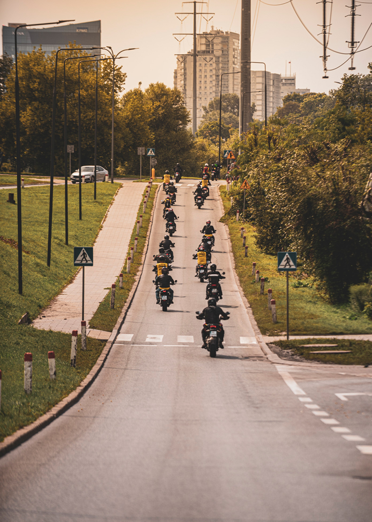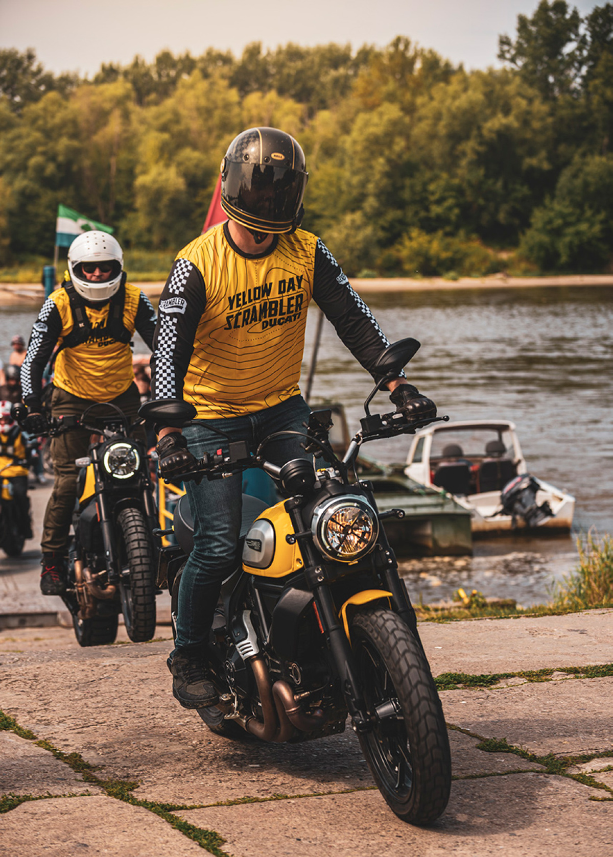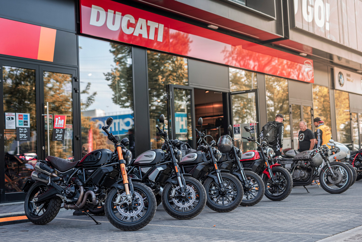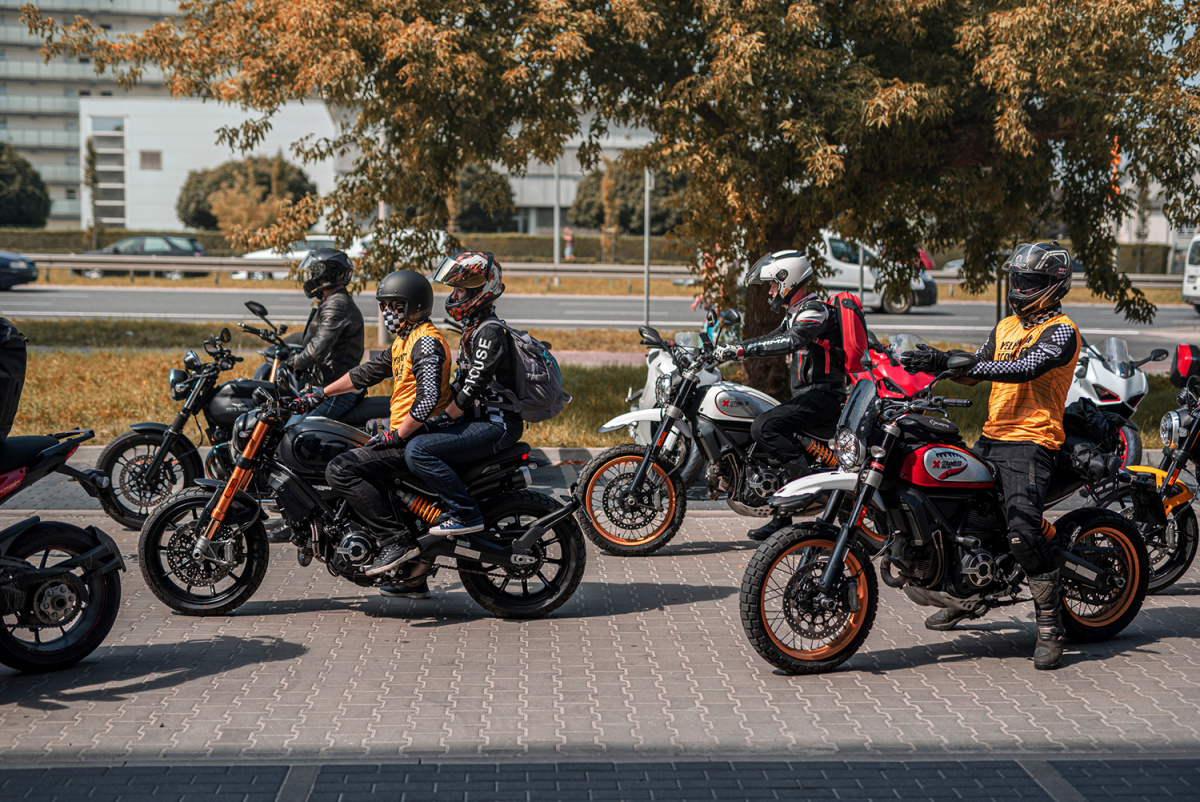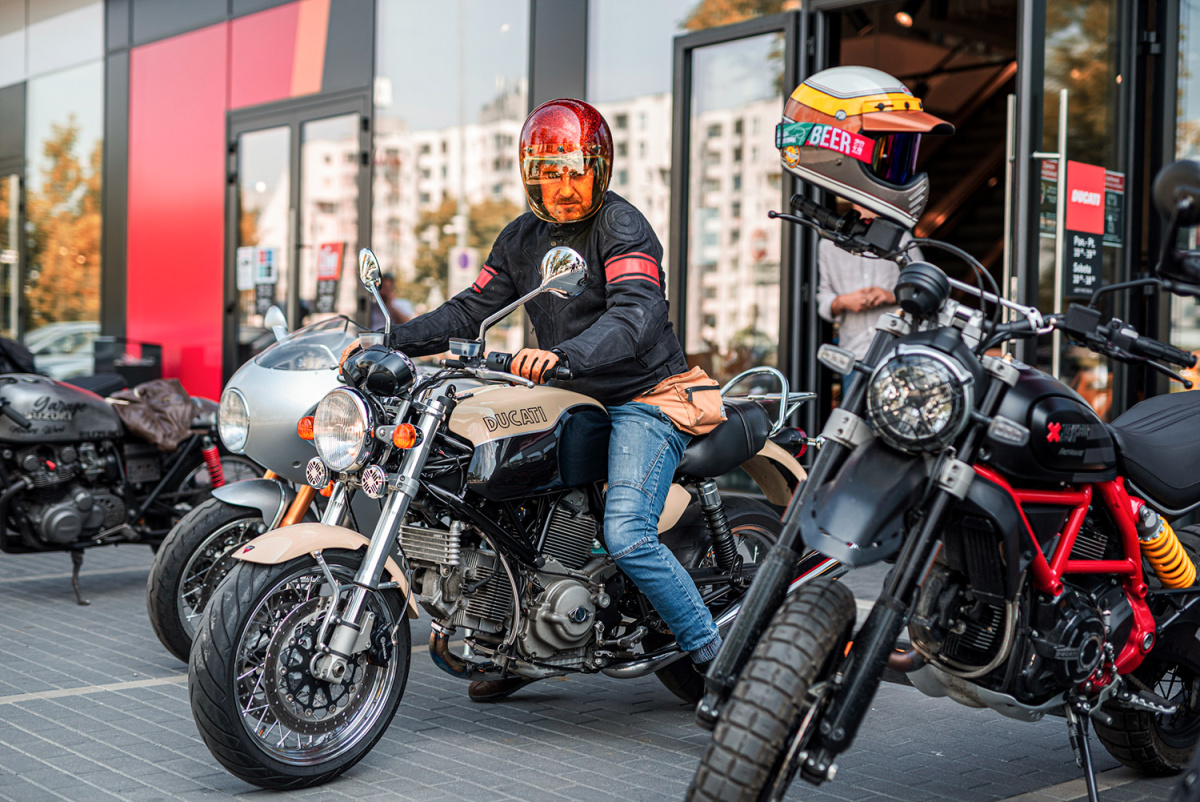 W sobotę 14 sierpnia spotkaliśmy się przed salonem Ducati Liberty Motors w Piasecznie w wyjątkowym składzie. Pijąc kawę obserwowaliśmy jak parking powoli wypełnia się kolejnymi Scramblerami, customami i unikatowymi sprzętami jak Ducati Paul Smart 1000, czy Ducati GT1000 SportClassic. Czuć było już nadchodzącą przygodę, więc wkrótce potem wsiedliśmy na nasze maszyny i ruszyliśmy w żółtym szyku w kierunku promu w Gassach, gdzie wraz z motocyklami przepłynęliśmy na drugą stronę Wisły. Trasa zaplanowana została w taki sposób, aby tego dnia wielokrotnie przekroczyć rzekę, więc przejechaliśmy też przez Most Południowy, Siekierkowski i Świętokrzyski. Na pamiątkowe zdjęcie zatrzymaliśmy się między innymi na błoniach PGE Narodowego, skąd następnie ruszyliśmy na obiad do Espotu w Elektrowni Powiśle.