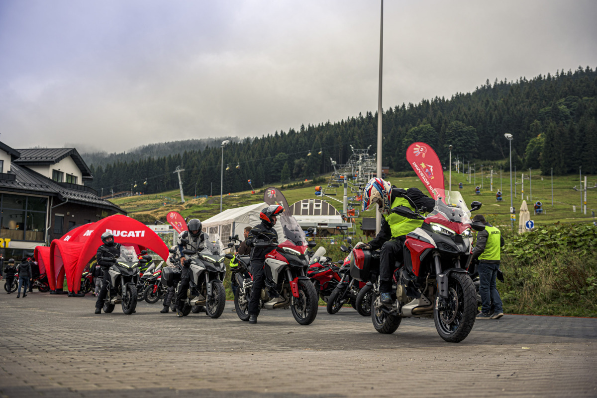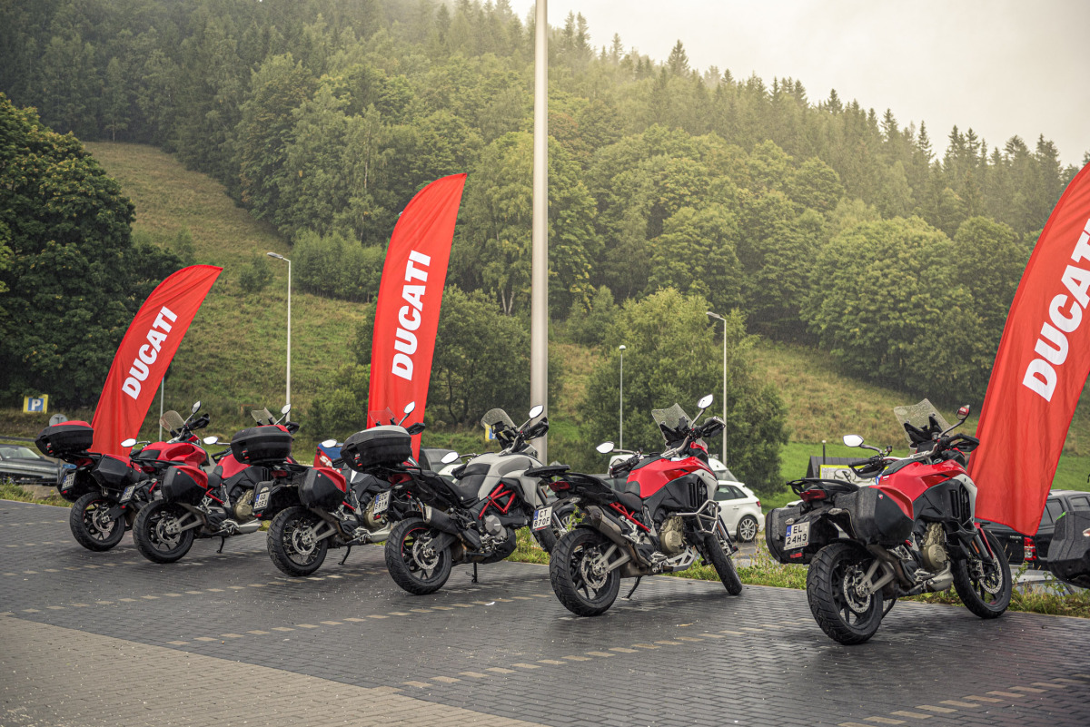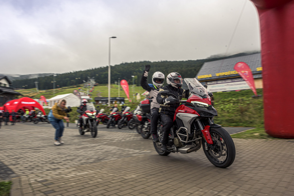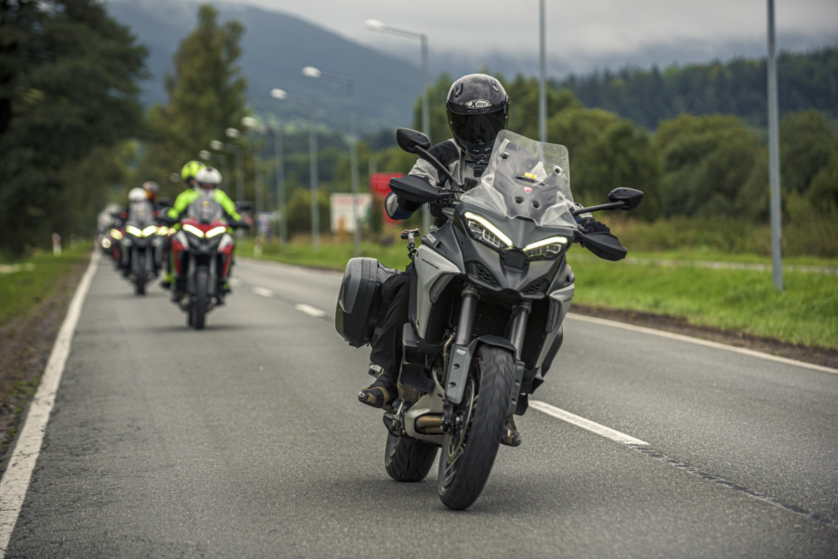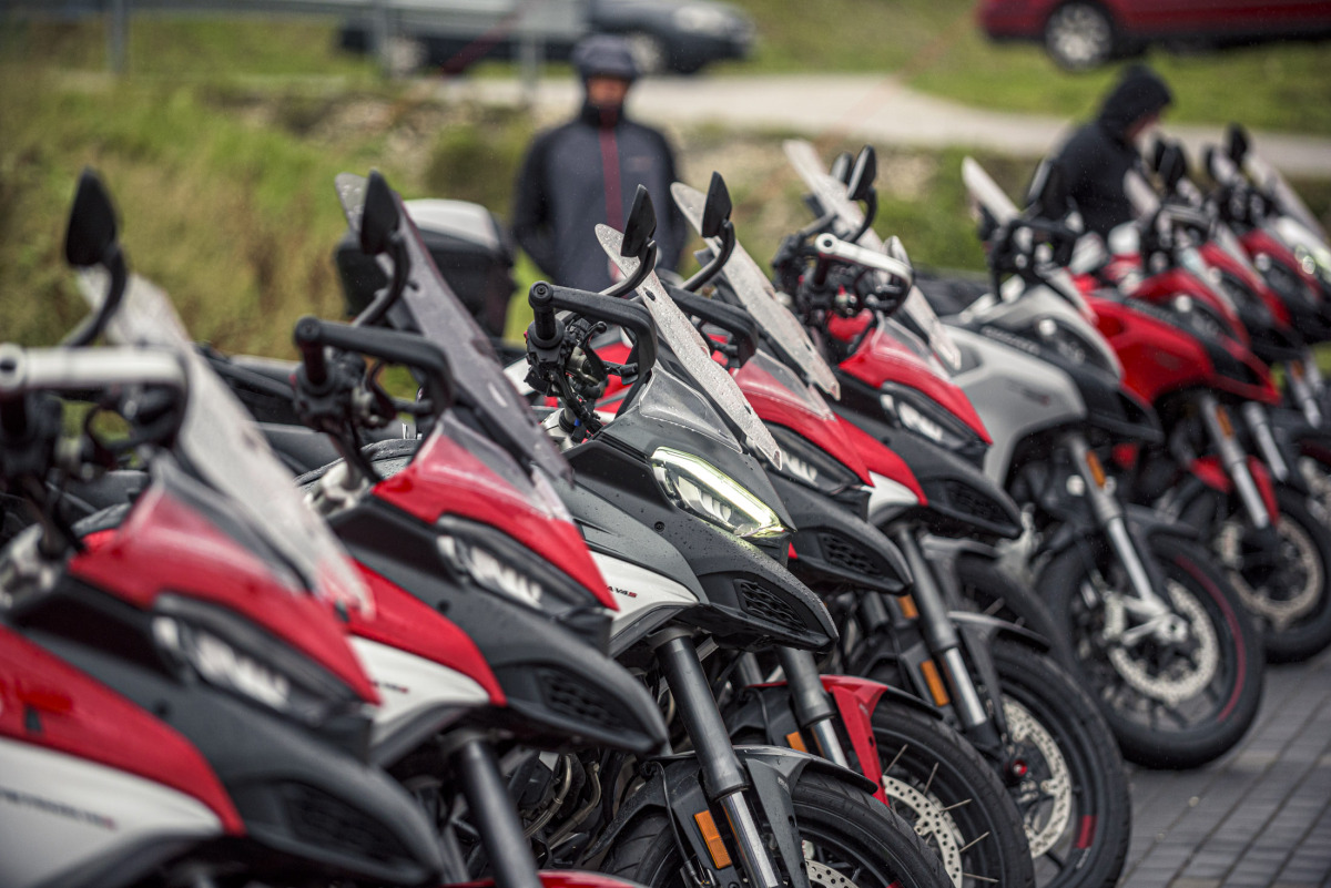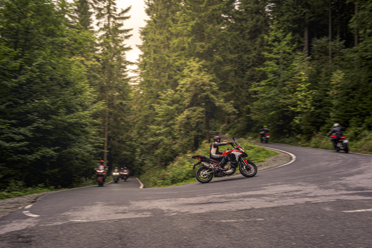 W sobotę po śniadaniu spotkaliśmy się na odprawie, podczas której zapowiedziane zostały nadchodzące atrakcje. Chwilę później uczestnicy podzieleni na trzy grupy usiedli na motocyklach, by ruszyć na kręte, okoliczne drogi. Warunki atmosferyczne nie były najlepsze, było wilgotno, ale trafiliśmy na kilkugodzinne okno pogodowe, kiedy nie padało. Pierwsza z grup rozpoczęła dzień od testów Ducati Multistrada V4 na około 100-kilometrowej, zróżnicowanej trasie. W tym samym czasie druga z grup pilotowanych przez instruktora objeżdżała inną pętlę na własnych motocyklach, a po powrocie obydwie zamieniały się pod hotelem. Trzecią z grup stanowili właściciele Multistrady V4, dla których przygotowaliśmy trasę specjalną o długości ponad 200 kilometrów. Wiodła ona między innymi Drogą Stu Zakrętów, a także innymi spektakularnymi szlakami. Widok tylu Multistrad na przepięknych, krętych trasach robił potężne wrażenie. Najnowsza V4 od Ducati, Królowa wszystkich dróg, udowodniła po raz kolejny, że jest gamechangerem w swojej klasie motocykli. Zachwyciła uczestników, którzy przyjechali na modelach konkurencyjnych marek.