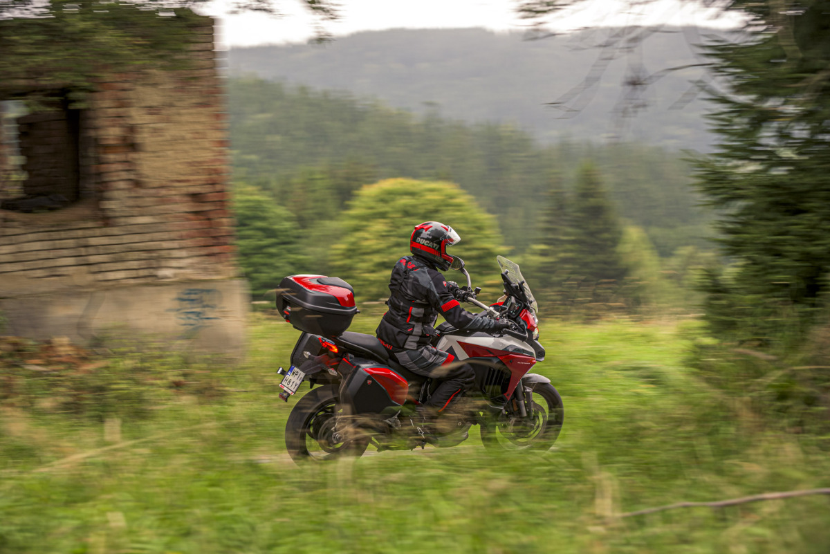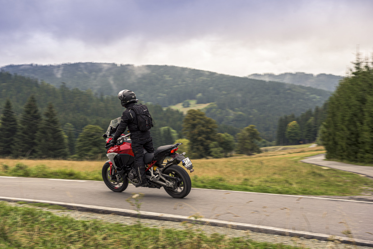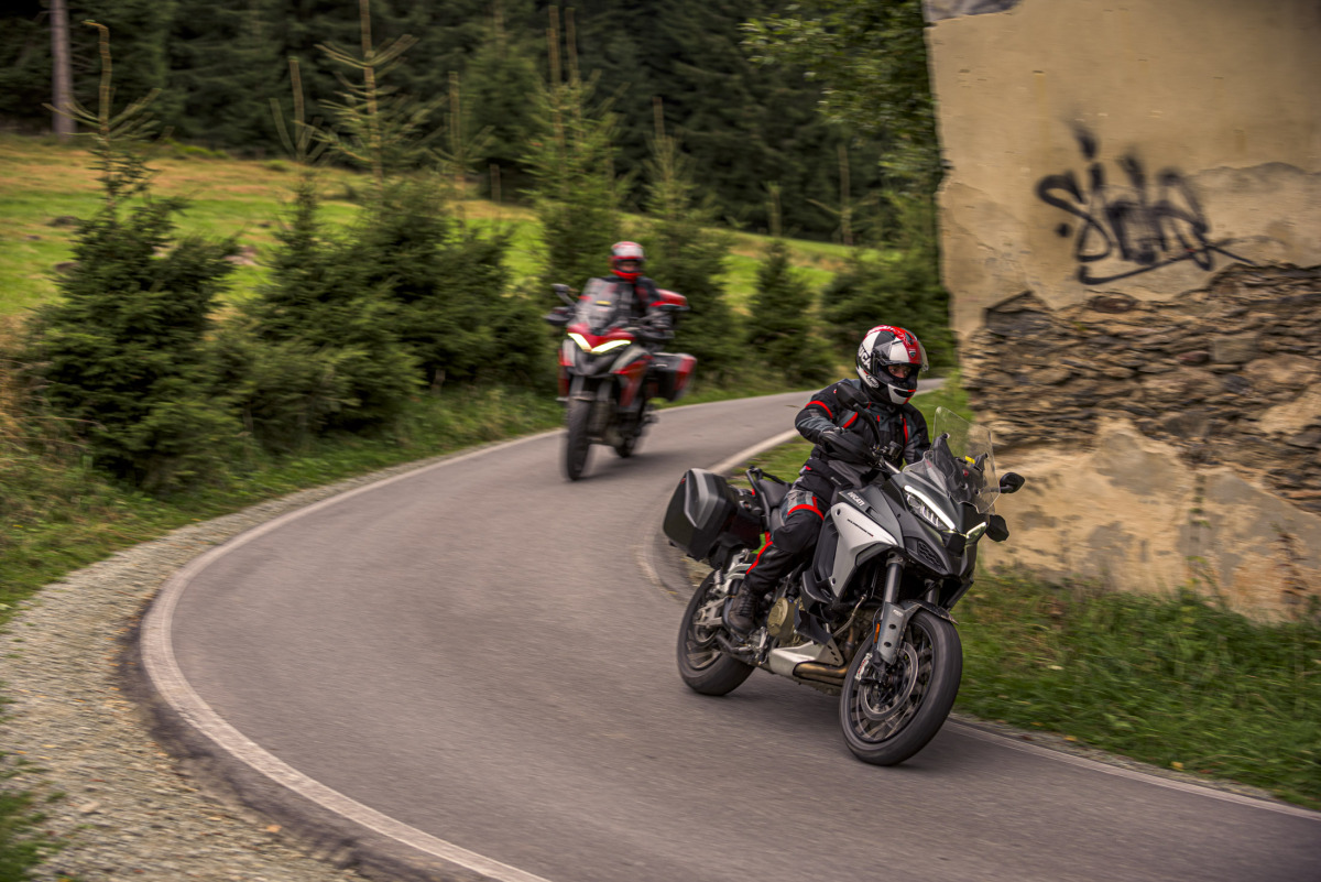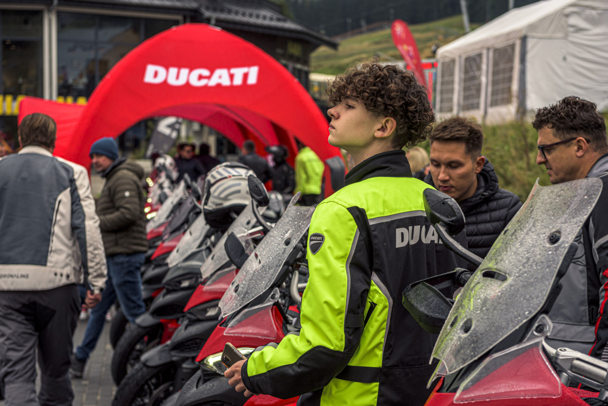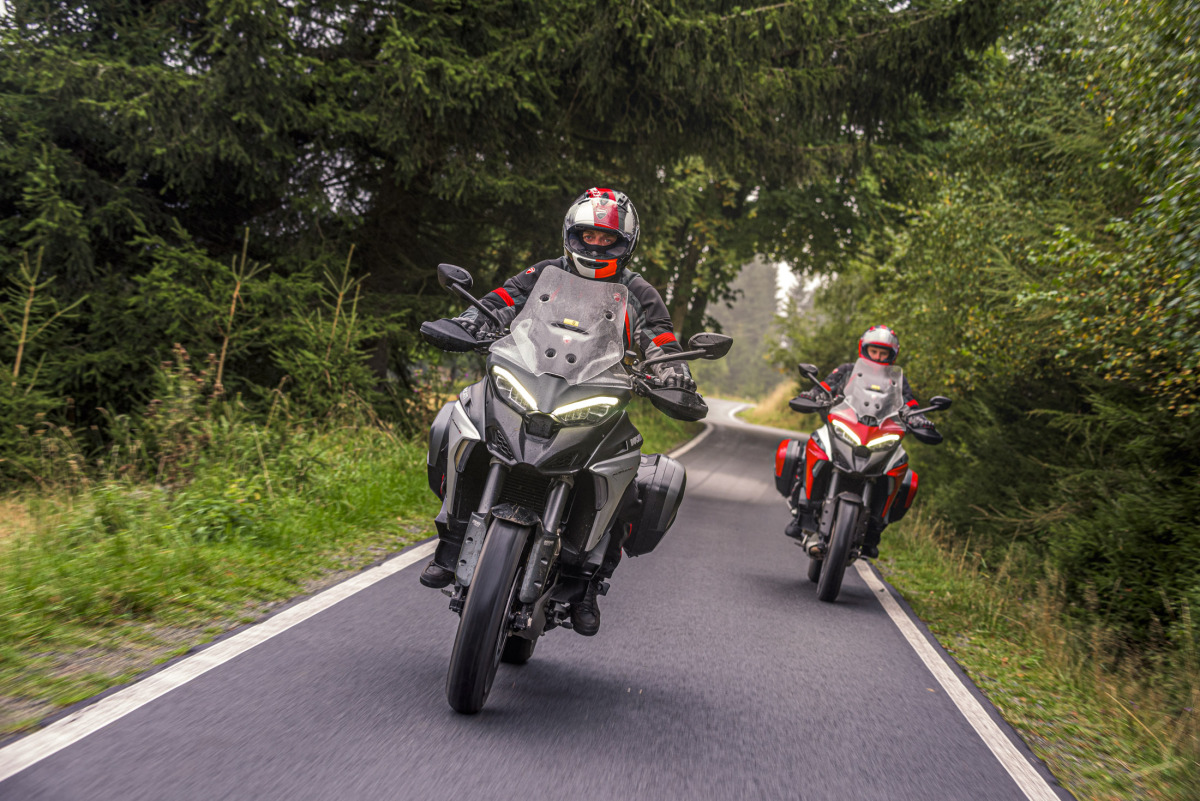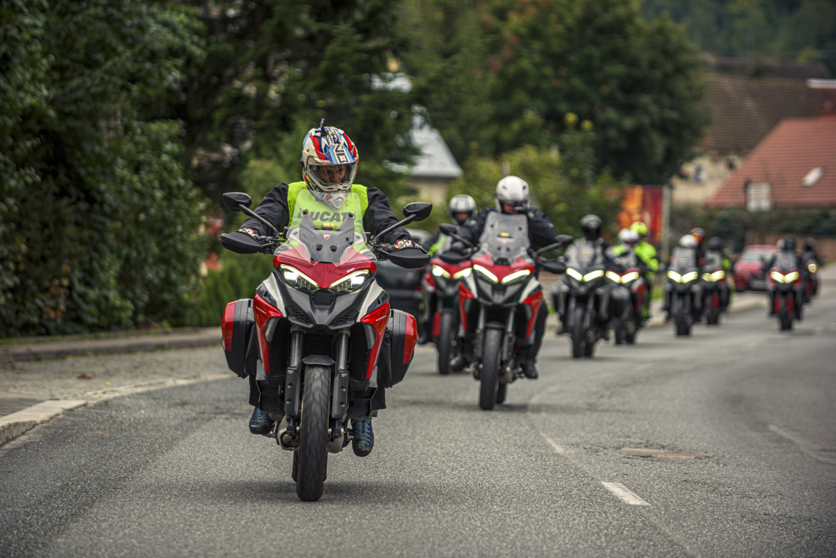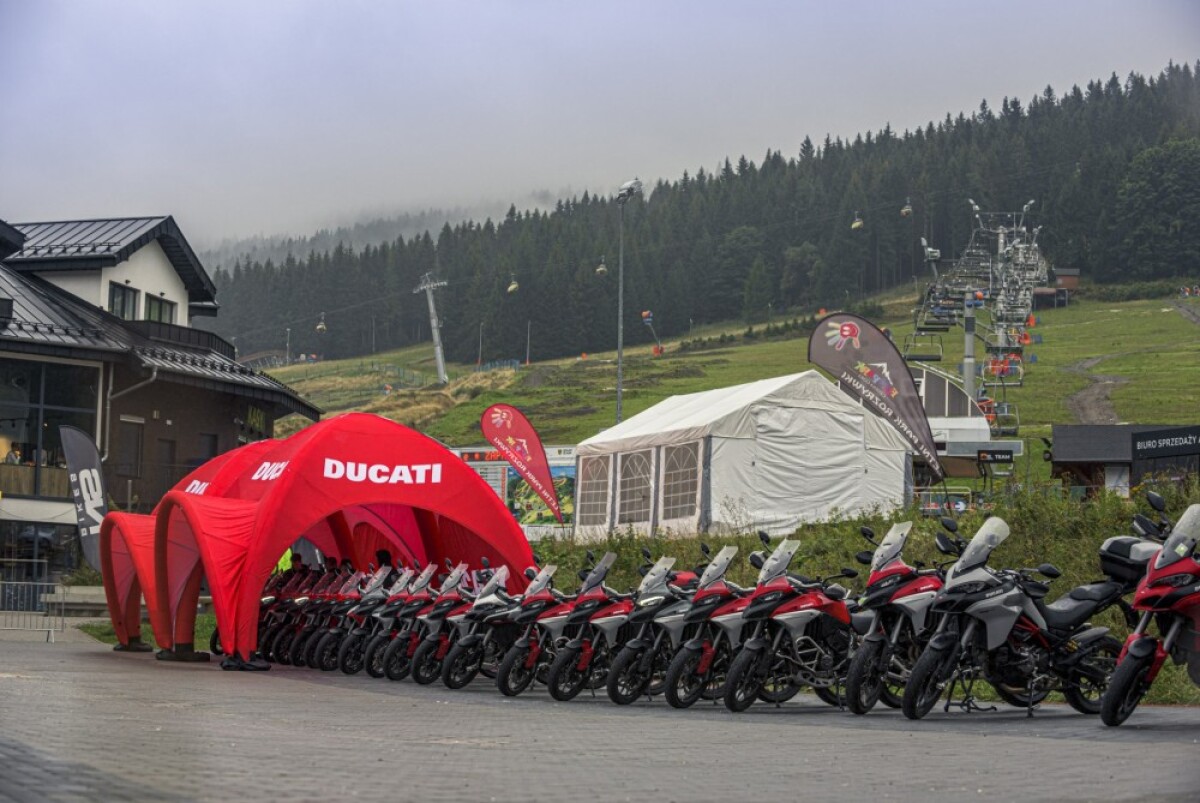 W sobotę po śniadaniu spotkaliśmy się na odprawie, podczas której zapowiedziane zostały nadchodzące atrakcje. Chwilę później uczestnicy podzieleni na trzy grupy usiedli na motocyklach, by ruszyć na kręte, okoliczne drogi. Warunki atmosferyczne nie były najlepsze, było wilgotno, ale trafiliśmy na kilkugodzinne okno pogodowe, kiedy nie padało. Pierwsza z grup rozpoczęła dzień od testów Ducati Multistrada V4 na około 100-kilometrowej, zróżnicowanej trasie. W tym samym czasie druga z grup pilotowanych przez instruktora objeżdżała inną pętlę na własnych motocyklach, a po powrocie obydwie zamieniały się pod hotelem. Trzecią z grup stanowili właściciele Multistrady V4, dla których przygotowaliśmy trasę specjalną o długości ponad 200 kilometrów. Wiodła ona między innymi Drogą Stu Zakrętów, a także innymi spektakularnymi szlakami. Widok tylu Multistrad na przepięknych, krętych trasach robił potężne wrażenie. Najnowsza V4 od Ducati, Królowa wszystkich dróg, udowodniła po raz kolejny, że jest gamechangerem w swojej klasie motocykli. Zachwyciła uczestników, którzy przyjechali na modelach konkurencyjnych marek.