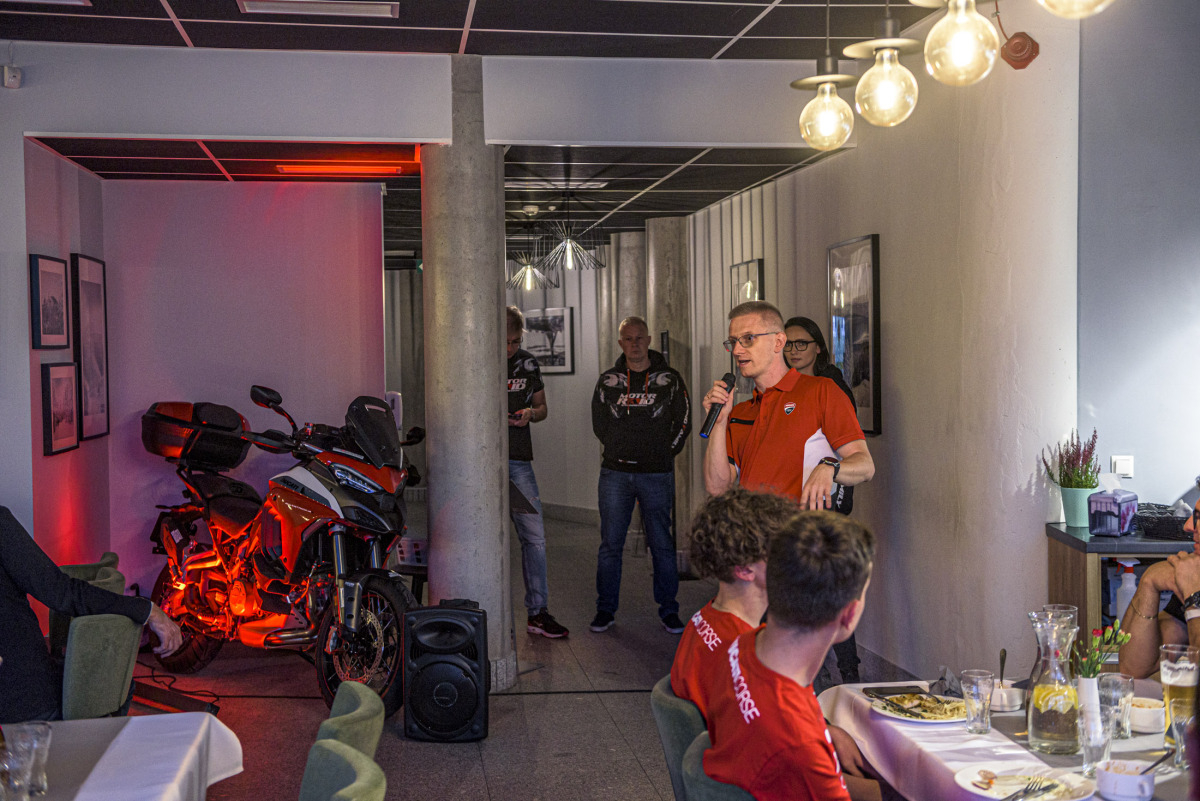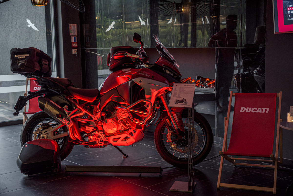 Nieopodal hotelowej recepcji na gości czekała jedna z dwóch demonstracyjnych Multistrad V4 S wyposażona w pakiety Touring i Enduro, a także szereg różnych akcesoriów, jak chociażby pełny układ wydechowy Akrapovič. Druga z nich, ozdobiona pakietami Touring, Performance i Urban, stanęła w restauracji, gdzie rozpoczęliśmy wydarzenie uroczystą kolacją. Krótką prelekcję dla uczestników wygłosił Andrzej Drzymulski ze Świata Motocykli. Opowiadał między innymi o swoim Ducati 959 Panigale Corse, o historii modelu Ducati Multistrada, o technologiach wykorzystanych w najnowszej generacji, a także o własnych odczuciach na temat motocykla, który testował jako jeden z pierwszych dziennikarzy w Polsce.