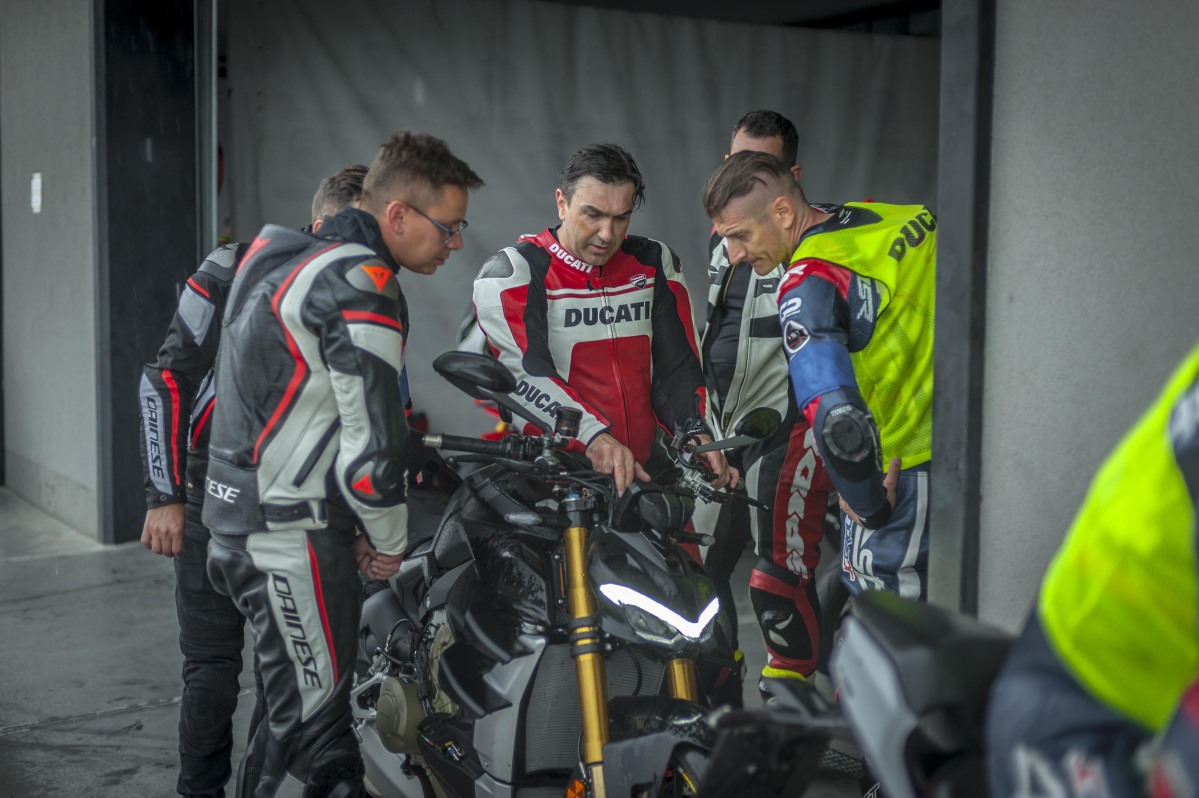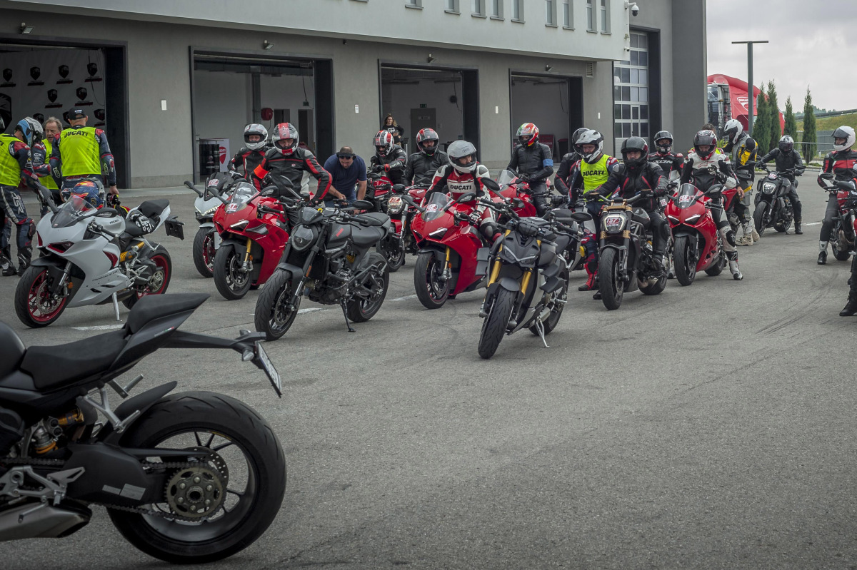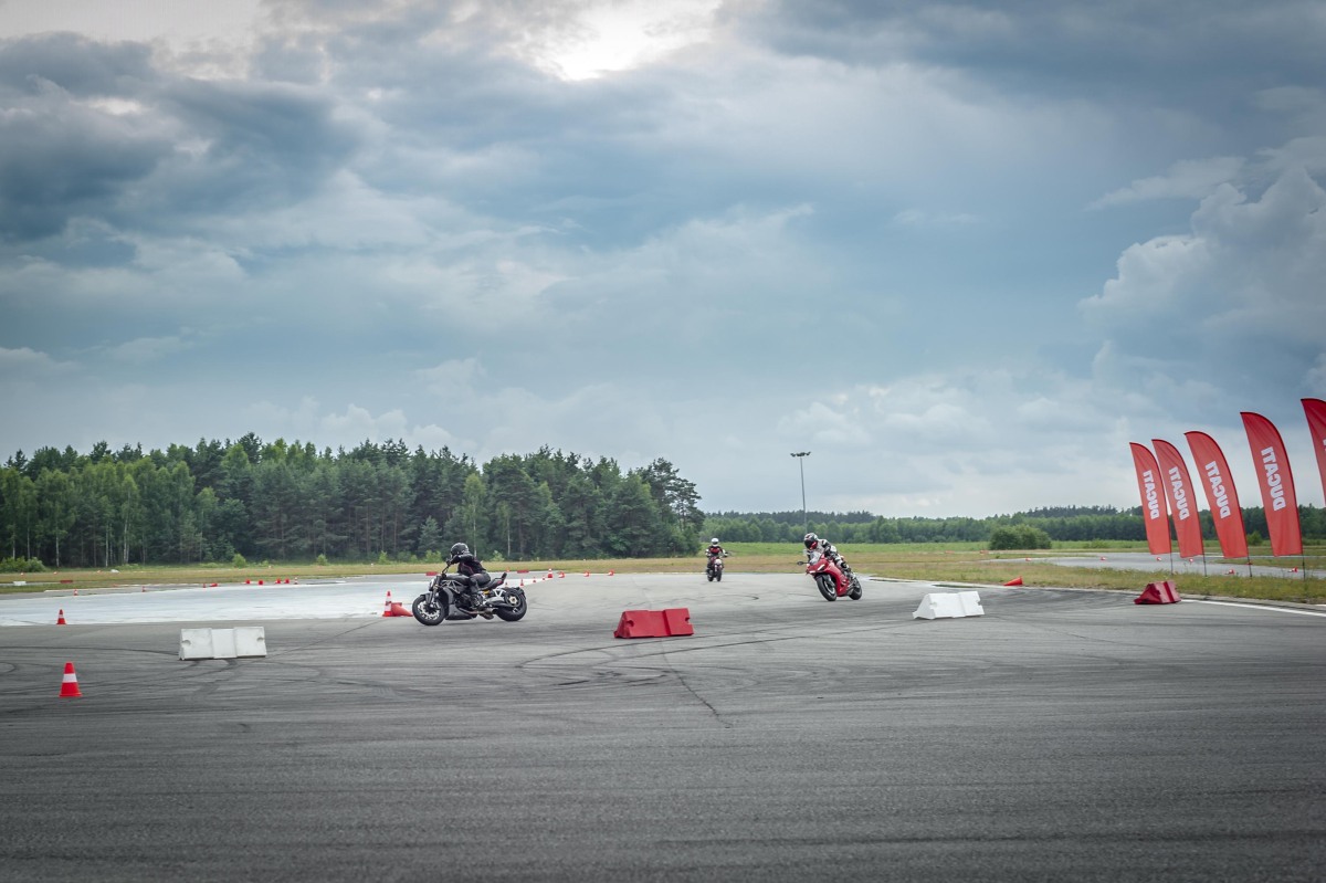 Podzieleni na grupy uczestnicy rozpoczęli zozapoznawanie się z poszczególnymi sekcjami trasy i wykonywali ćwiczenia przygotowane przez profesjonalnych instruktorów. Wszystko po to, aby nabrać pewności na motocyklu oraz skorygować ewentualne błędy w pozycji jazdy i prowadzeniu. Z każdym kolejnym wykonanym zadaniem zgromadzone na imprezie Ducati pochylały się coraz niżej asfaltu, a ich właściciele odczuwali coraz większą satysfakcję.
