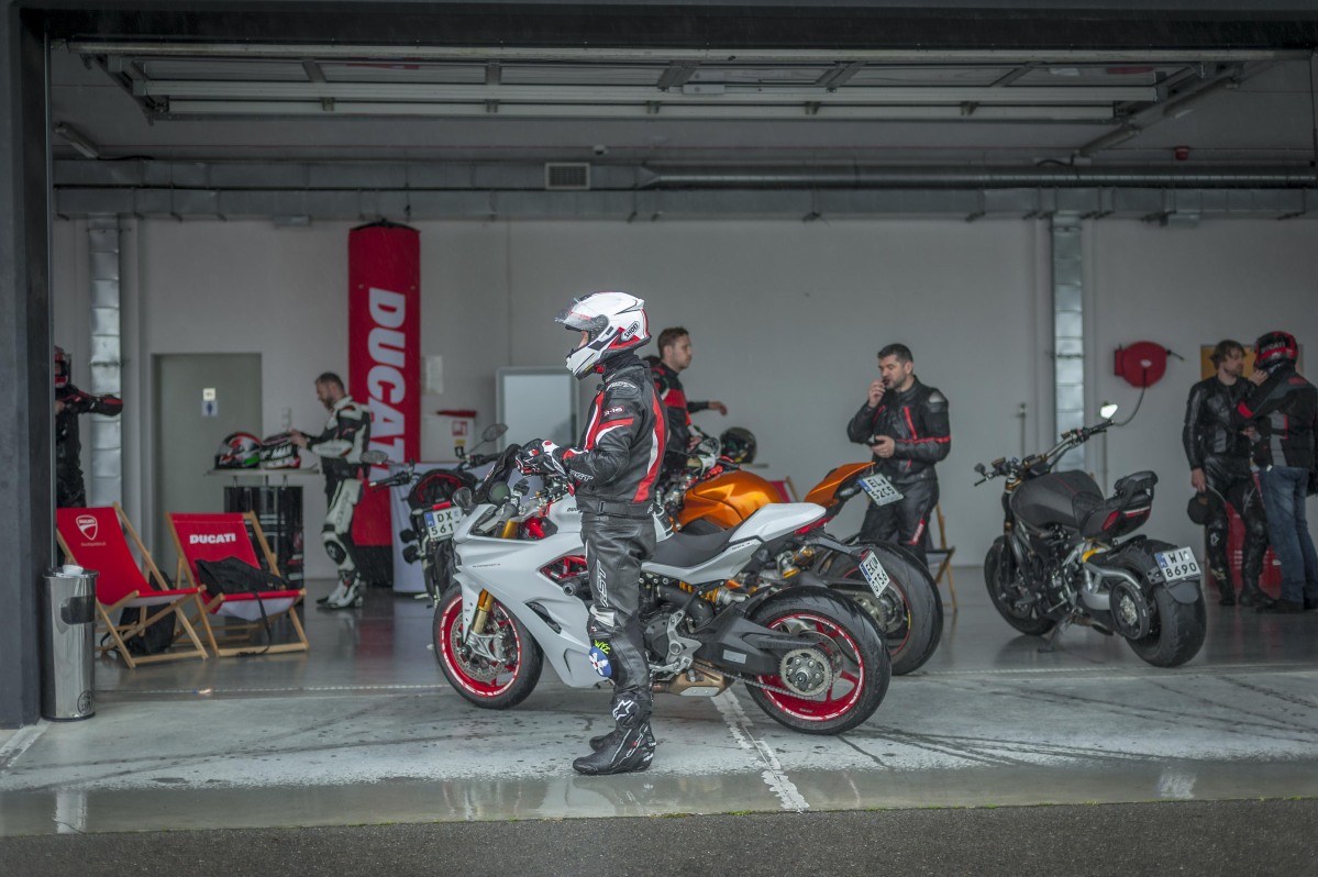 Trening przerwał deszcz, który obficie zlał trasę i tym samym uniemożliwił wykonywanie ćwiczeń. W trosce o bezpieczeństwo instruktorzy podjęli decyzję o powrocie do padoku. Chwilowa przerwa od jazdy sprzyjała nawiązywaniu nowych znajomości, a zgromadzonych w boksach uczestników połączyła pasja do motocykli Ducati. Niedługo potem nad Tor Jastrząb znów wyszło słońce i szybko osuszyło asfalt. Jazda pełną nitką toru o długości około 1700 metrów była zwieńczeniem wiedzy zdobytej podczas szkolenia. Szybkie zakręty, techniczne szykany, ciasne nawroty, czy długi łuk za wzniesieniem sprawiały uczestnikom znacznie mniej trudności niż na początku.