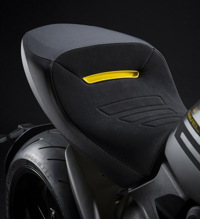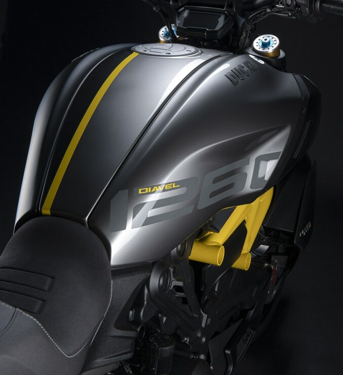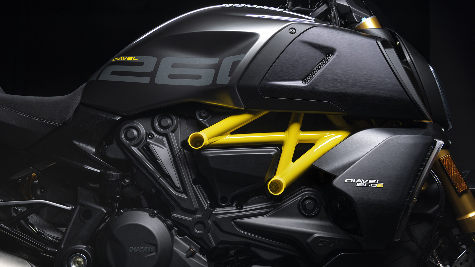 Pokrywy zbiornika paliwa wykonane są z blachy. Są one smuklejsze w strefie kontaktu z siedziskiem, aby poprawić ergonomię kierowcy. Dwa duże wloty powietrza ze szczotkowanego aluminium, będące rozwinięciem koncepcji z pierwszego Diavela, nadają maszynie wyjątkowy charakter. Krótki, niewielki ogon mieści wysuwany uchwyt pasażera i zestaw świateł, dzięki czemu tył Diavel 1260 S utrzymany jest w lekkim, sportowym stylu, który wyraźnie kontrastuje z mocnym przodem.