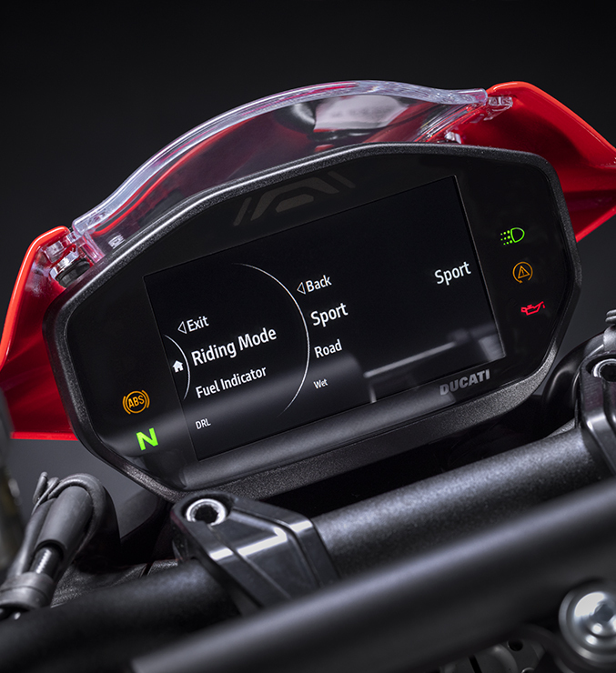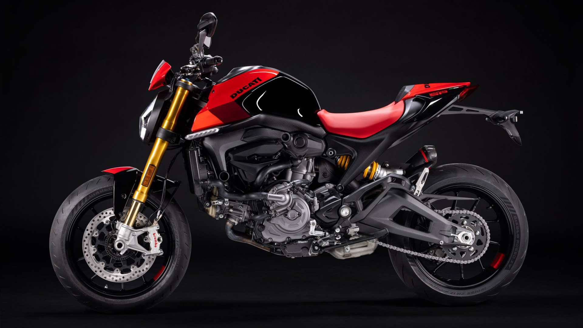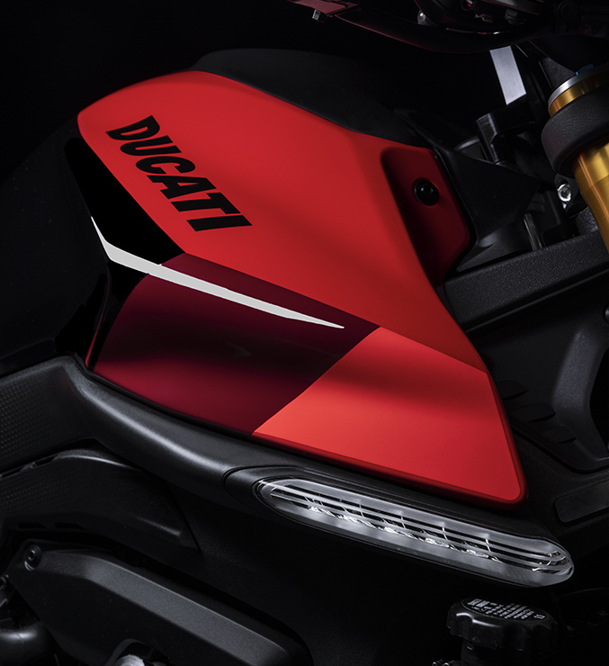 Od podstawowej wersji Monstera, wersję SP wyróżniają też ciekawe detale jak czerwone siedzisko, czy większy napis Ducati na zbiorniku paliwa, nawiązujący do Panigale V4.