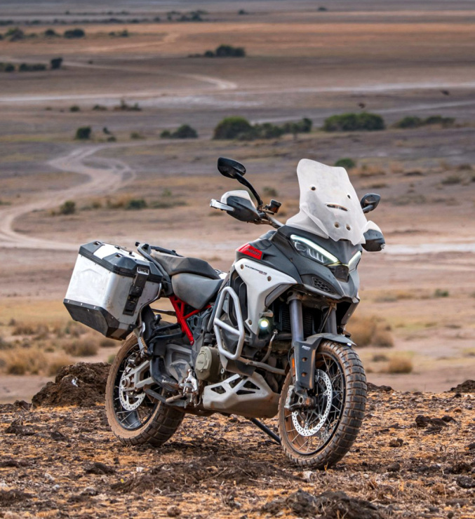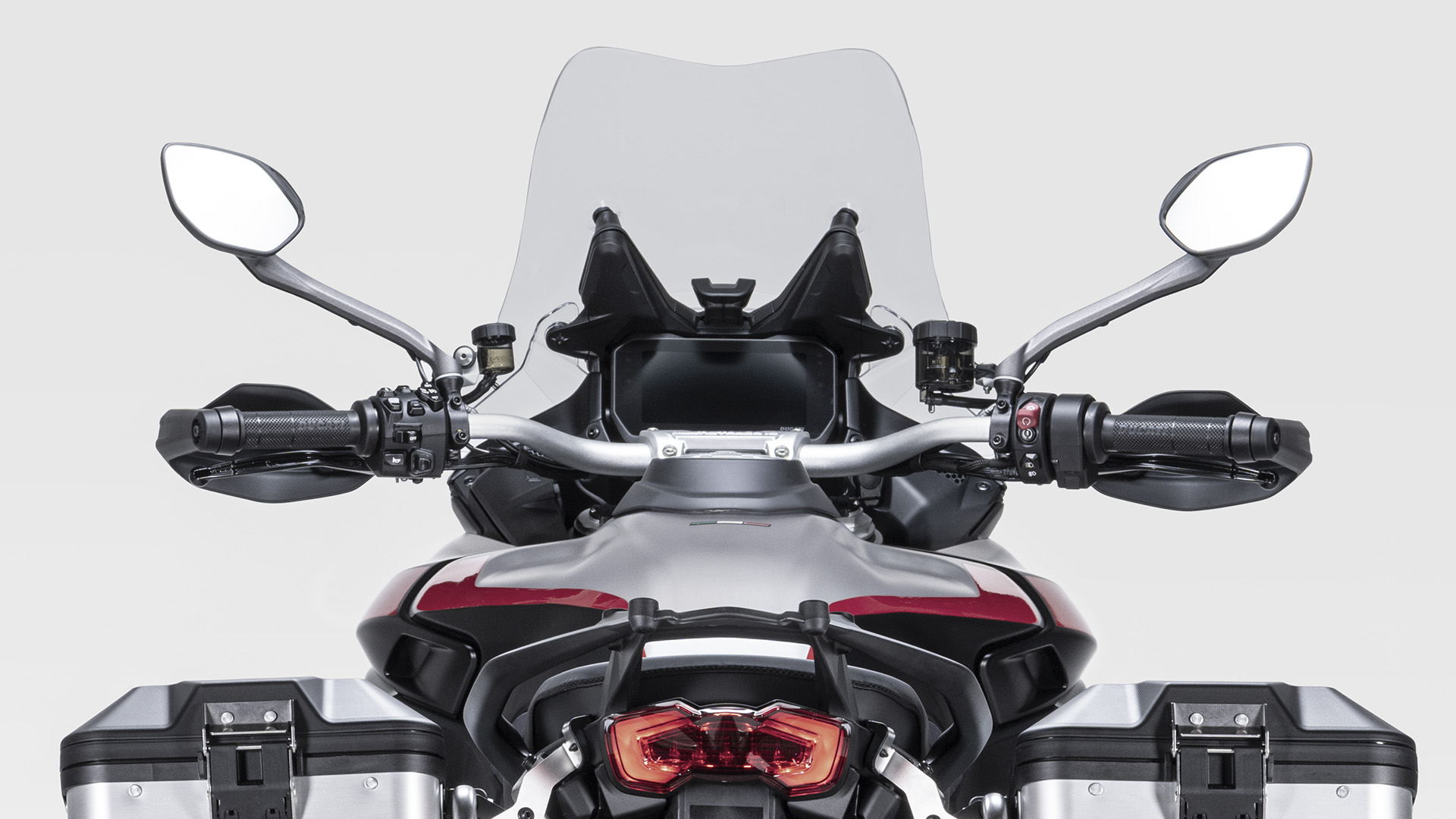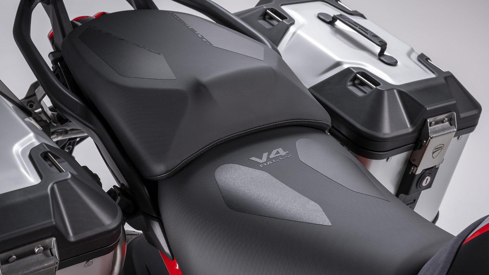 Multistrada V4 Rally jest gotowa na eksplorowanie najbardziej odległych obszarów dzięki nowemu bakowi z aluminium o pojemności 30 litrów, którego kształt harmonijnie współgra z muskularnymi i eleganckimi liniami motocykla. Została zaprojektowana tak, aby wynieść komfort kierowcy i towarzysza podróży na najwyższy poziom. W tym celu przeprojektowano przednią szybę (zwiększono jej wysokość o 40 mm i szerokość o 20 mm), wydłużono ogon i cofnięto mocowanie kufra, aby zaoferować więcej miejsca dla pasażera. Obydwa siedziska mają różne warianty wysokości, aby można było dostosować Multistradę V4 do indywidualnych preferencji.