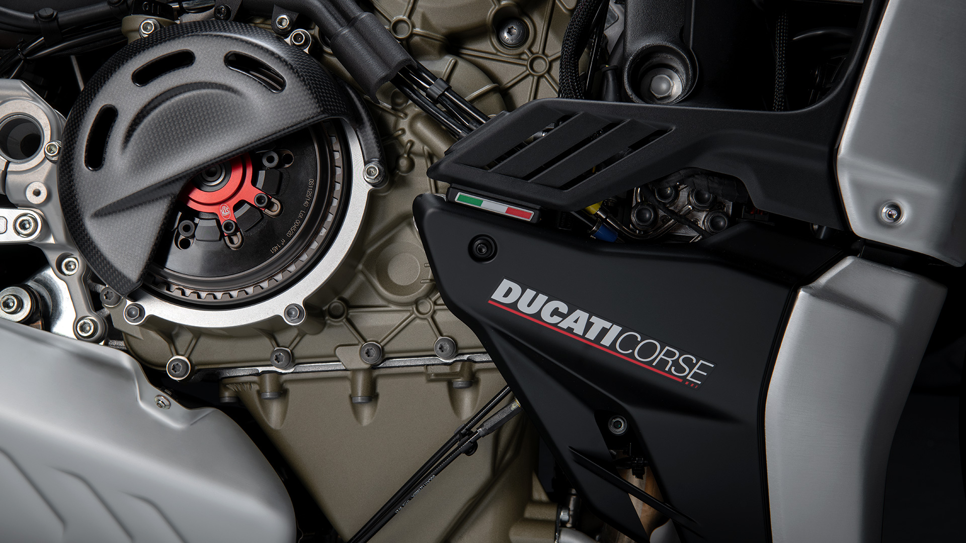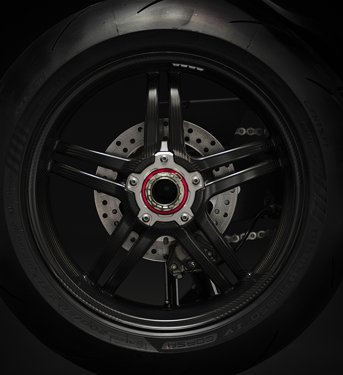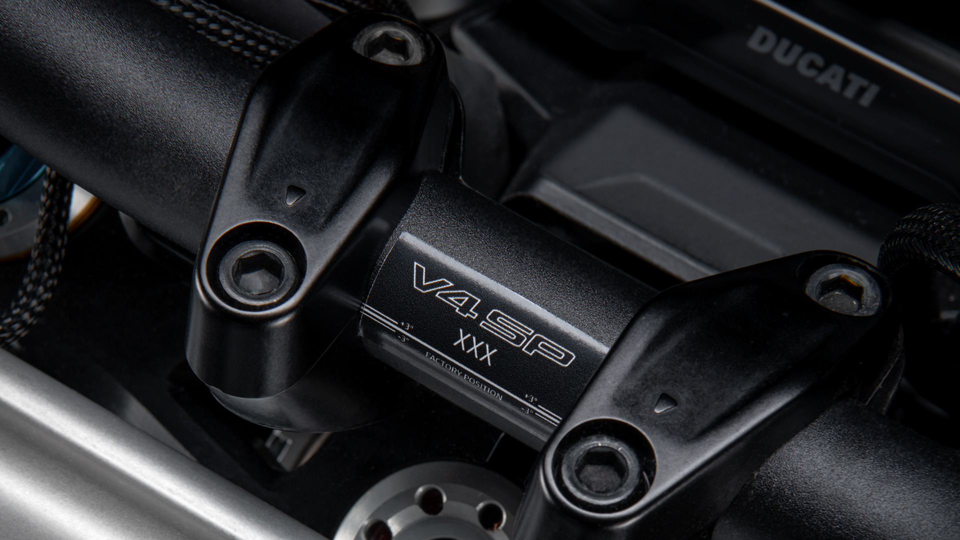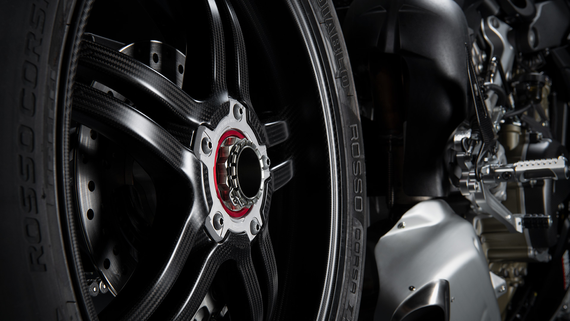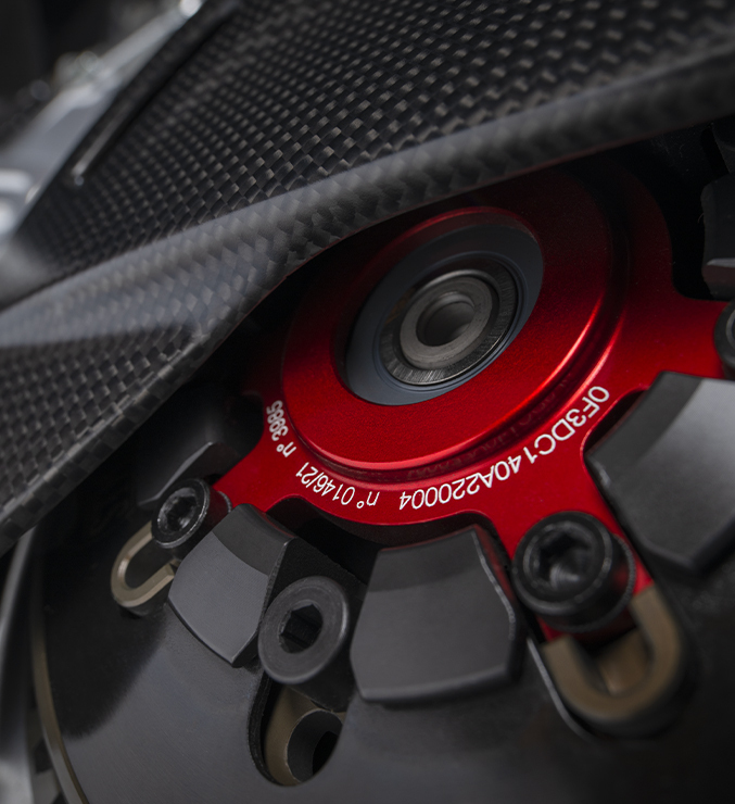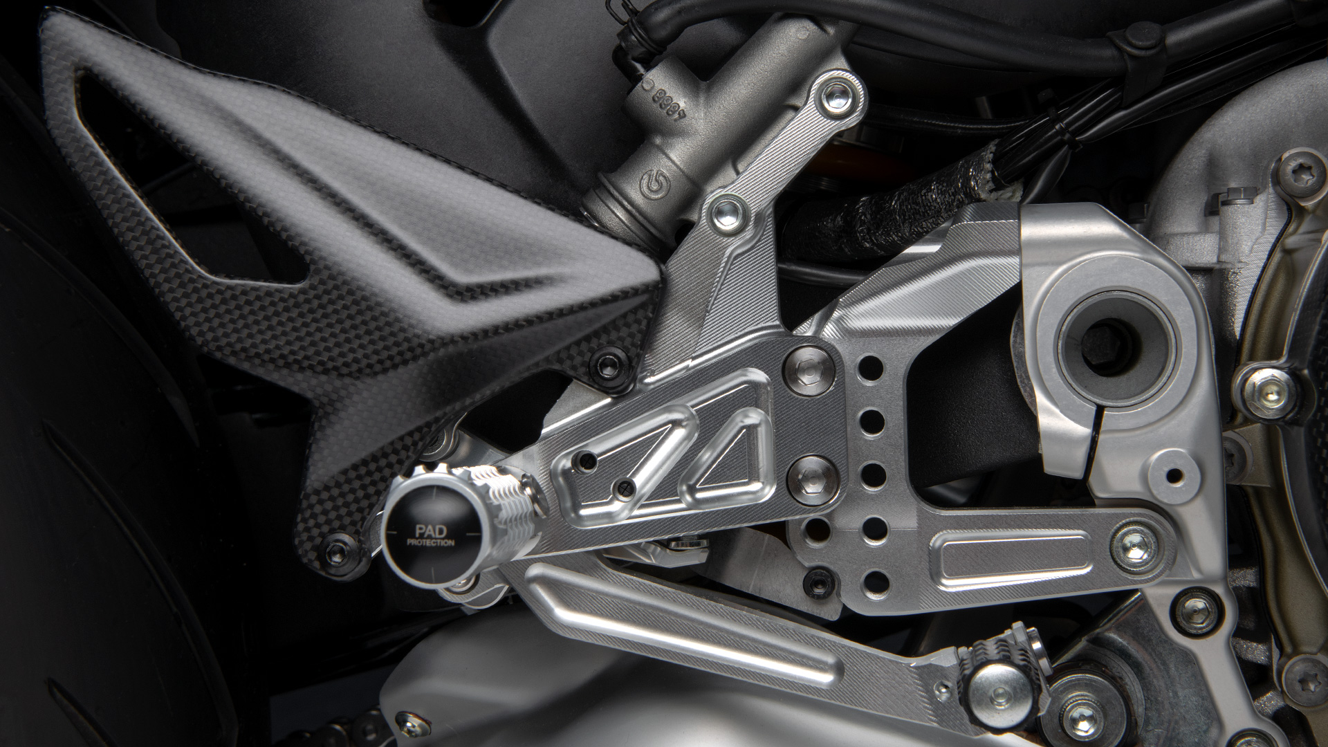 Wyposażenie uzupełniają regulowane podnóżki aluminiowe, które umożliwiają prowadzącemu znalezienie optymalnej pozycji, przedni błotnik karbonowy oraz akcesoria przydatne na torze, takie jak otwarta osłona sprzęgła z włókna węglowego, czy zaślepki do demontażu lusterek i uchwytu tablicy rejestracyjnej.